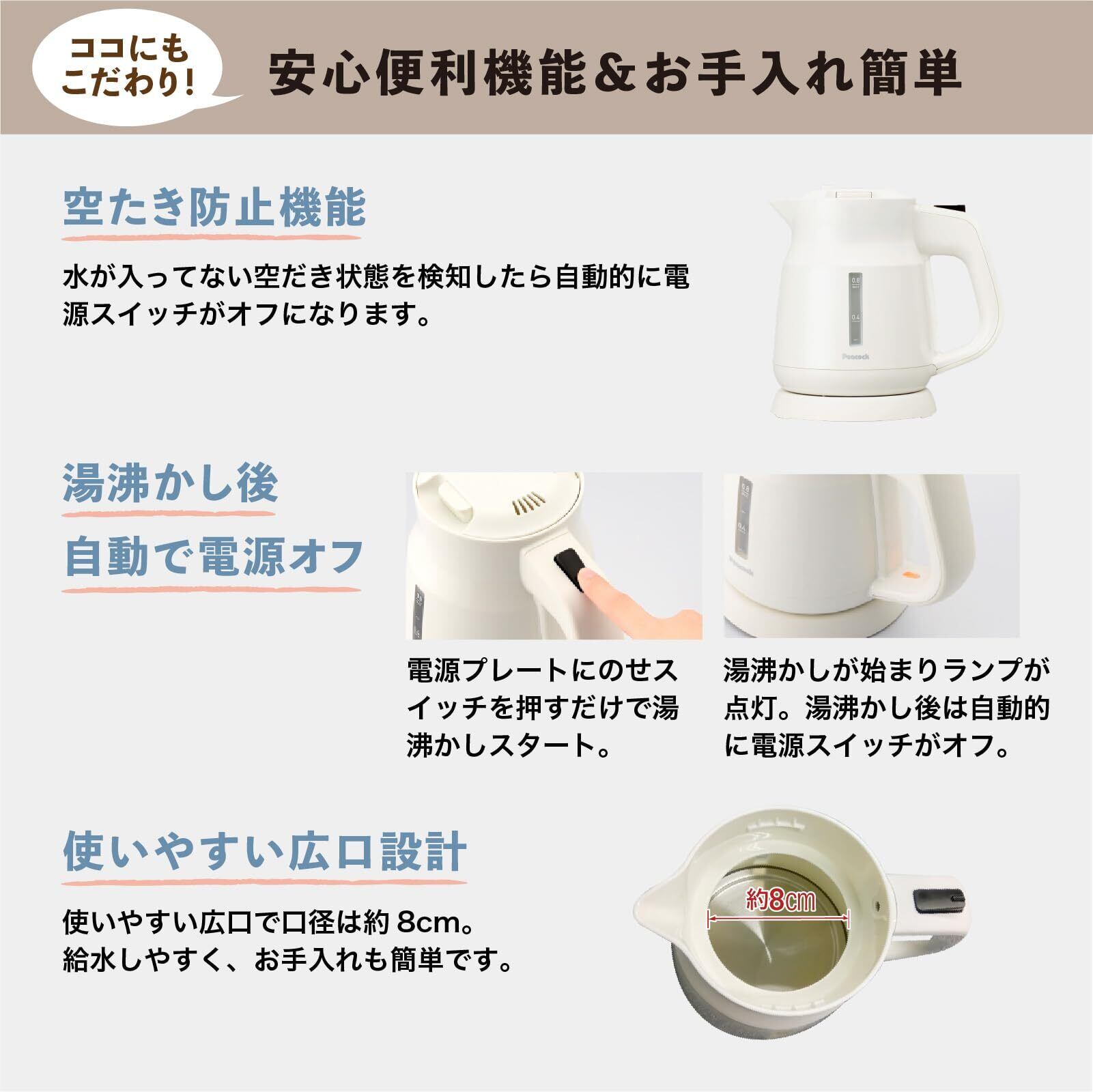 【転倒湯漏れ防止機能】:倒してしまってもふたはしっかりロックされているためこぼれにくい構造です。注:完全止水ではないため、少量は出る場合がございます。 【ワンプッシュ着脱ふた】:ワンタッチでふたが外れるので給水やお手入れに便利です。 【給湯ロック】:ロックをすれば注水ができなくなります。 【空だき防止】:水が入っていない状態では、通電は自動的にオフになります。 【プラスチックボディ】:樹脂ボディはサビずにお手入れがラクです。 【デザイン】:ミルクピッチャーを思わせるかわいいフォルムでリビングにピッタリ。【コードレス給湯】:本体と電源コードは分かれているので持ち運びや給湯に便利です。 【湯沸かし時間】:0.8L(満水)は約5分20秒で沸きます。 カップ1杯約140ccなら約90秒のスピード湯沸かしです。