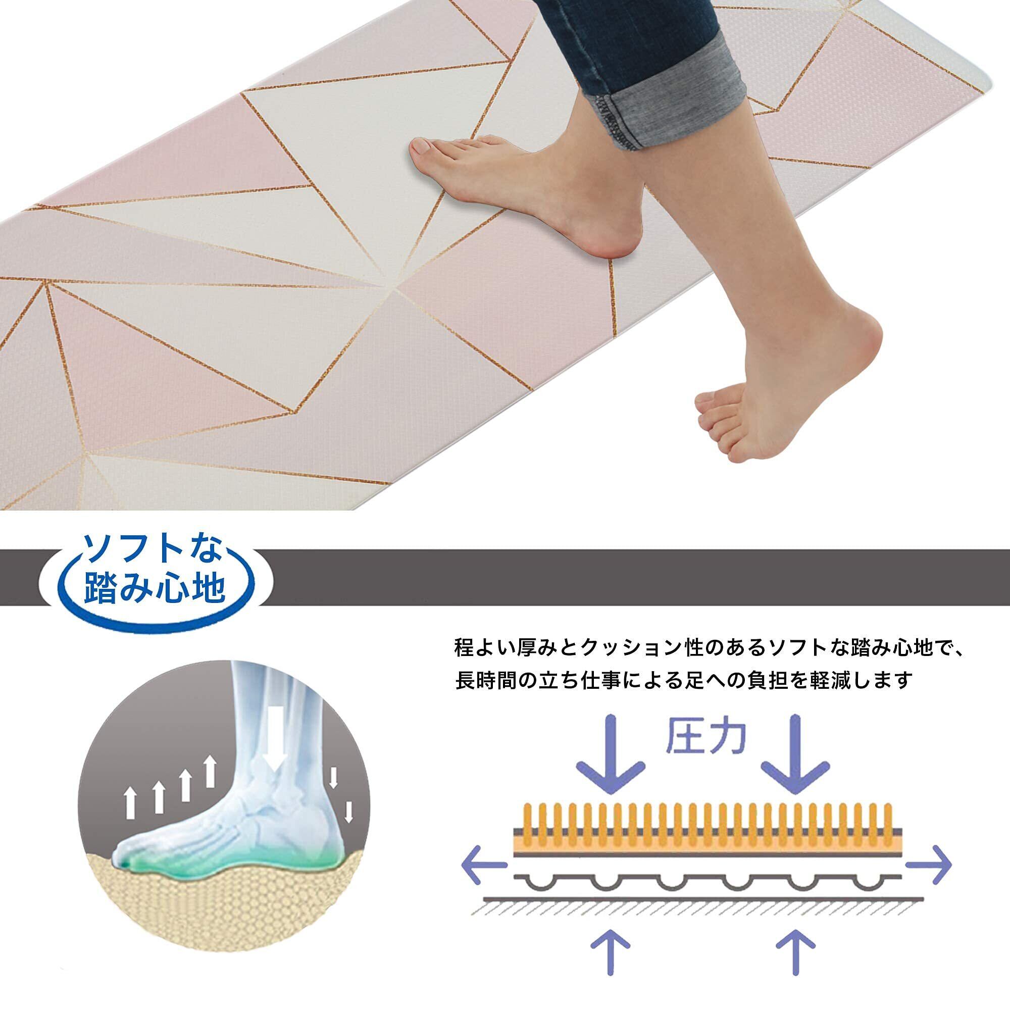 「足が疲れにくい・ソフトな踏み心地」程よい厚みとクッション性のあるソフトな踏み心地で長時間の立ち仕事による足への負担を軽減します。厚さがあるので、冬場に床からの冷気も和らげます。物が落下しても衝撃を吸収し、床をキズやヘコミから守ります。【厚さアップ】厚さ8㎜から10㎜へアップしました。
