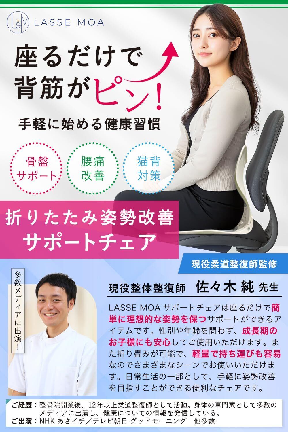 【現役の柔道整復師監修】現役整体整復師の佐々木先生に監修いただき、座るだけで簡単に理想的な姿勢を保つことができる「姿勢サポートチェア」を開発しました。