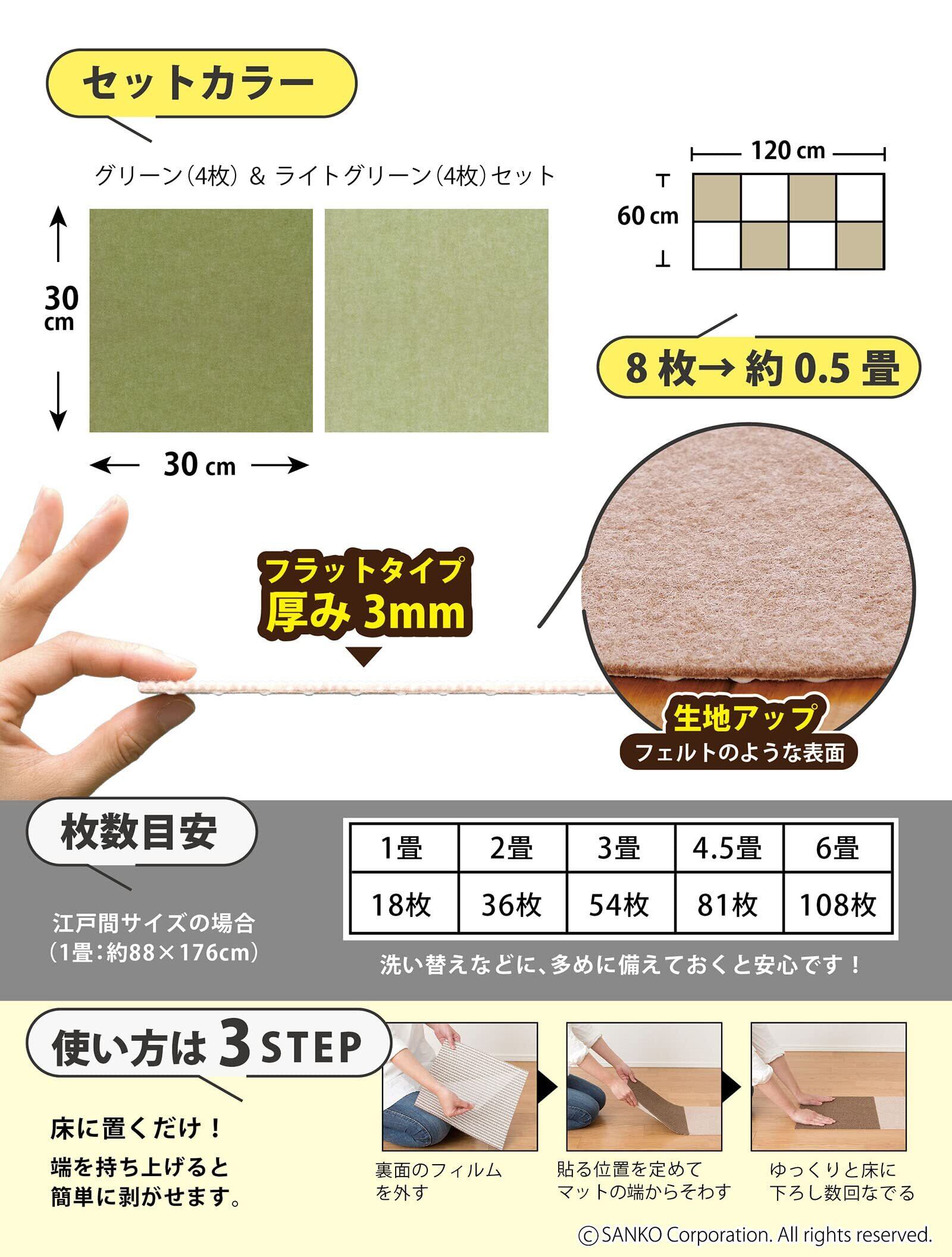 【日本製 撥水 消臭 洗える】サンコー ずれない タイルカーペット 30×30cm グリーンセット 8枚 フラットタイプ おくだけ吸着 ジョイントマット KD-33
