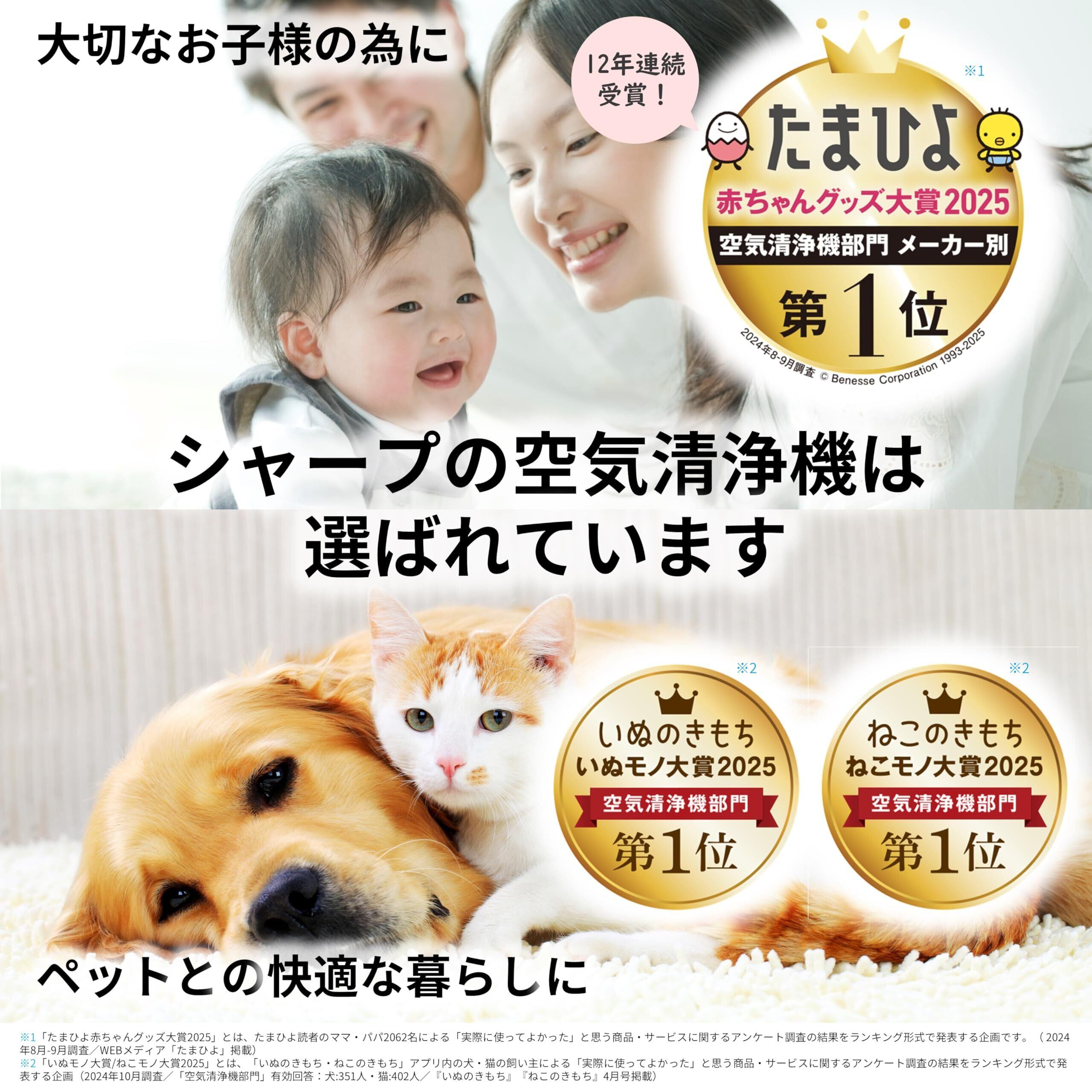 ・シャープ独自の空気浄化技術、プラズマクラスター7000を搭載しています。・プラズマクラスター空気清浄機の特長である、お部屋全体に風の流れが素早く行き渡るスピード循環気流。遠くのホコリも引き寄せて大きな背面全体の吸込口でパワフルに吸引します。プラズマクラスターイオンが静電気を除去しながら、効率良く集じんします。 ・プレフィルターについた大きなホコリは、後ろパネルをつけたまま、掃除機で吸い取るだけ。簡単にお掃除ができます。・1日24時間使用した時の電気代は、強運転時で約36円、中運転時で約9.7円、静音運転時なら約1.9円と低コスト※電力料金目安単価31円/kWh(税込)[2022年7月改定](家電公取協調べ)で算出