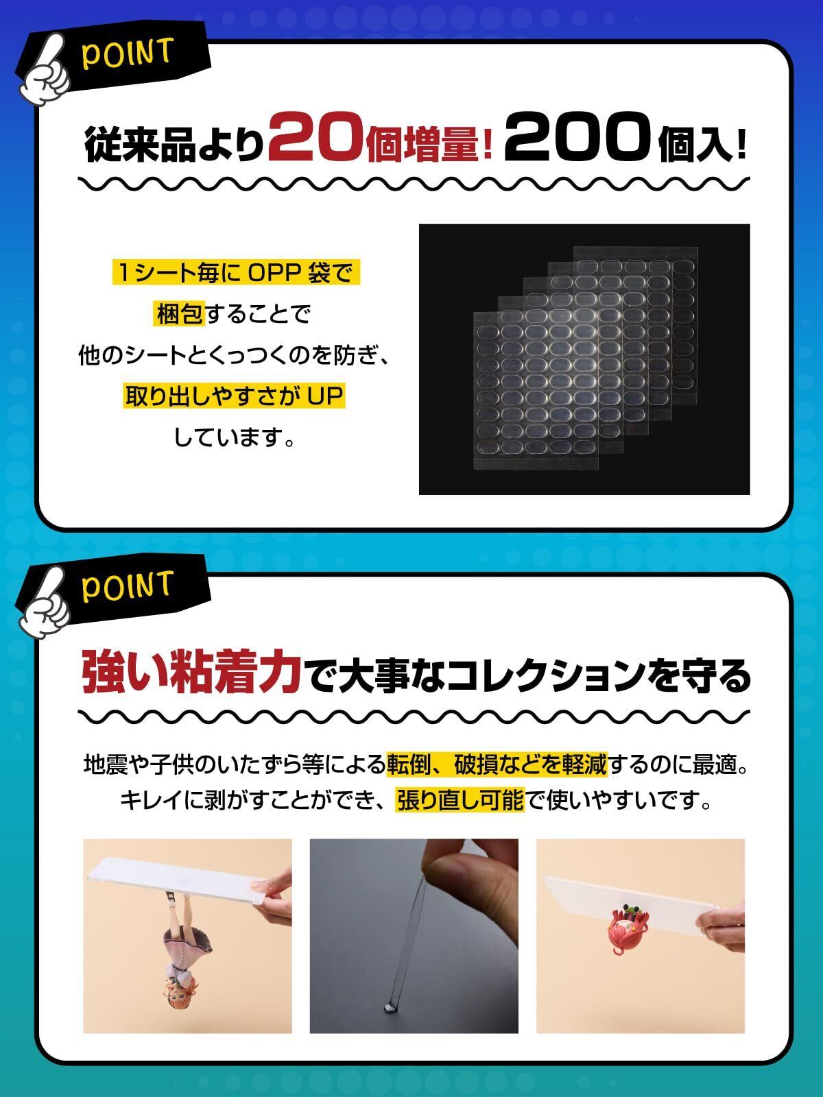 【従来品より20個増量!200個入】 1シート毎にOPP袋で梱包することで他のシートとくっつくのを防ぎ、取り出しやすさがUPしています。 200粒あるので、大きなフィギュアには複数貼ることもできて安心です。
