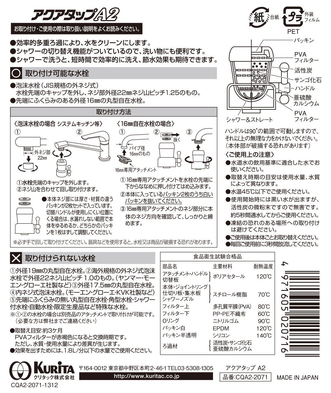 クリタック 自在水栓・泡沫水栓用 浄水蛇口 アクアタップA2 020716