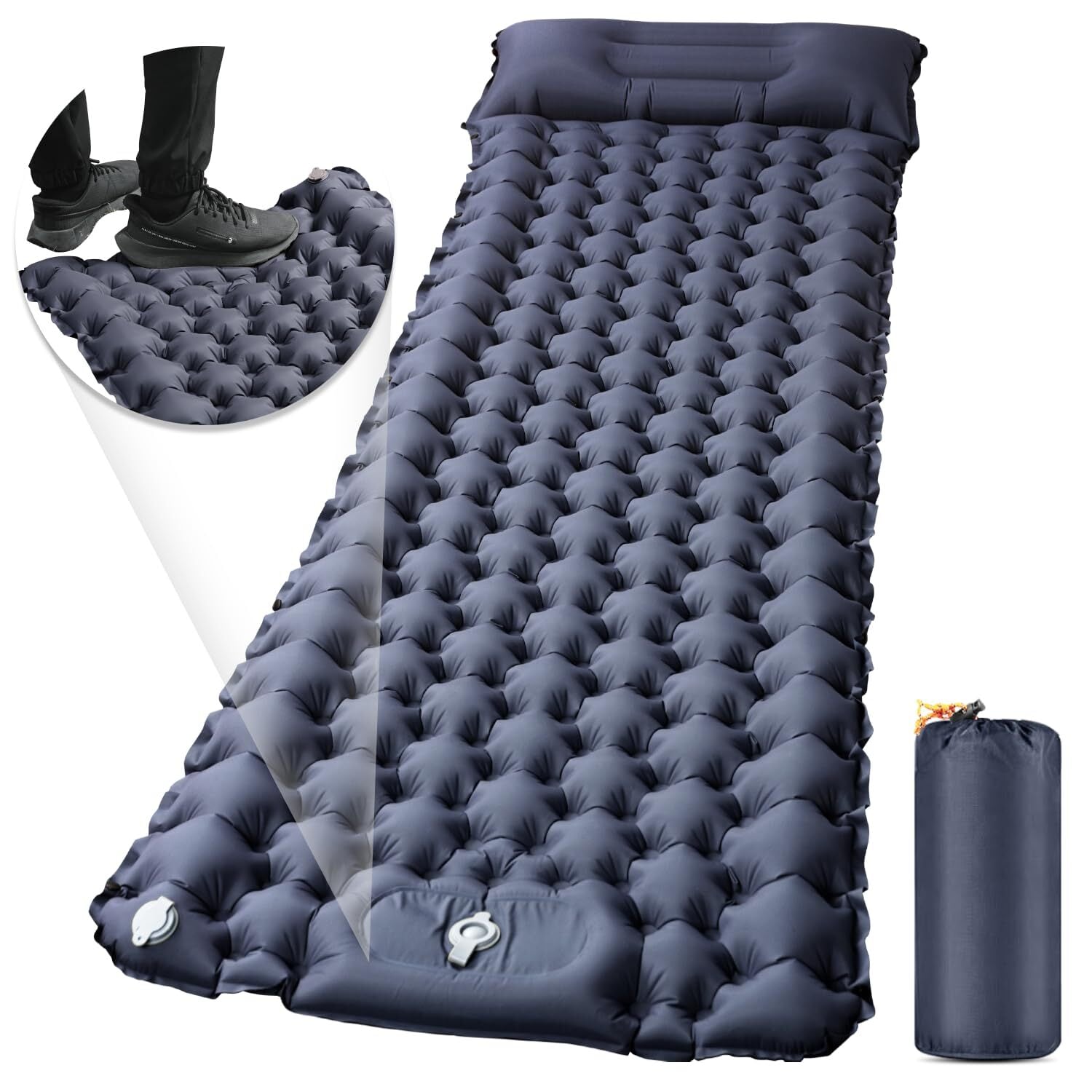 【30秒で素早く膨らむ・足踏み式】このアウトドア マットはポンプや空気充填機を単独で購入する必要はありません。足部には足踏み式エアポンプが内蔵されており、電動エアポンプ、手動エアポンプ、吹き付けなどの従来の空気充填方式とは異なり、30〜60秒でマットが完全に膨らみます。空気の放出はわずか1秒で簡単に行え、撤収もストレスフリー。さらに、アップグレードされたダブルバルブ設計により、空気漏れの心配もなく、夜中にマットがへたる心配はありません。