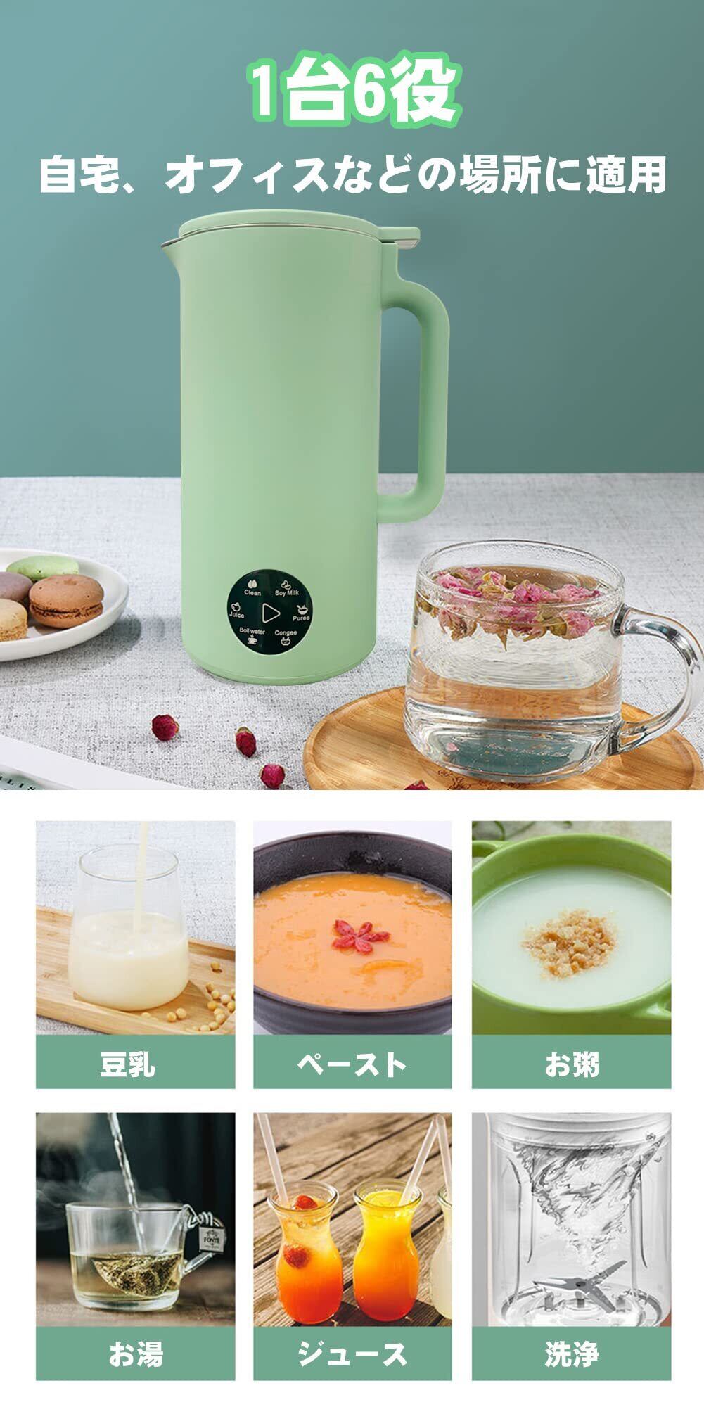 一台6役 :豆乳・ペースト・お粥・お湯・ジュース・洗浄。ボタンを押すだけで加熱調理から粉砕まで全自動で行う加熱式ブレンダーです。いわば、電気ケトルとフードプロセッサーを合わせた一台!食材を丸ごと、沸騰させずに調理するので、大豆そのままの栄養を含んだ豆乳をご自宅で楽しめます。ポタージュや離乳食はもちろん、非加熱モードでフレッシュジュースも!