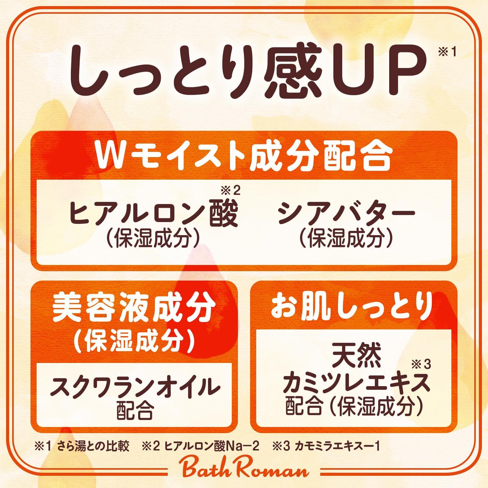 ●【商品説明】●Wモイスト成分配合・ヒアルロン酸(保湿成分)・・・角質層へ浸透し、お肌の水分バランスを保ちます。●・シアバター(保湿成分)・・・お肌をやさしく包み込みうるおい感あふれる肌に。●美容液成分(保湿成分)スクワランオイル配合●有効成分が温浴効果を高め血行を促進し、疲労回復・冷え症・荒れ性に効果的です。●お肌にやさしい天然カミツレエキス配合(保湿成分)●さら湯のピリピリ感をやわらげる塩素除去成分配合●アレルギーテスト済み(全ての方にアレルギーが起きないわけではありません。●)●赤ちゃん(生後3ヵ月以上)と一緒に入浴する時も使えます。●たっぷり約30回分 ※20g使用の時●医薬部外品。●【販売名】バスロマンBSB-1●【効能 効果】●疲労回復、冷え症、荒れ性、あせも、しっしん、にきび、ひび、しもやけ、あかぎれ、肩のこり、腰痛、神経痛、リウマチ、痔、うちみ、くじき、産前産後の冷え症●【使用方法】●お風呂のお湯(200L)に20g~30gの割合でよくかき混ぜながら、溶かしてください。●キャップで計量できます。●(20g:目盛線1杯/30g:目盛線1...