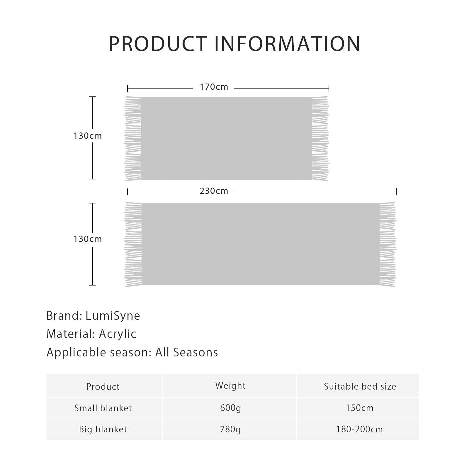 【サイズの選択】私たちの毛布は2つのサイズでご利用いただけます。 大きい毛布のサイズは230cm * 130cm(フリンジを含む)で、180-200cmのベッドに適しています。小さい毛布のサイズは170cm * 130cm(フリンジを含む)で、150cmのベッドに適しています。 ご購入前にサイズ情報をご確認の上、ご自分に合ったサイズをお買い求めください。