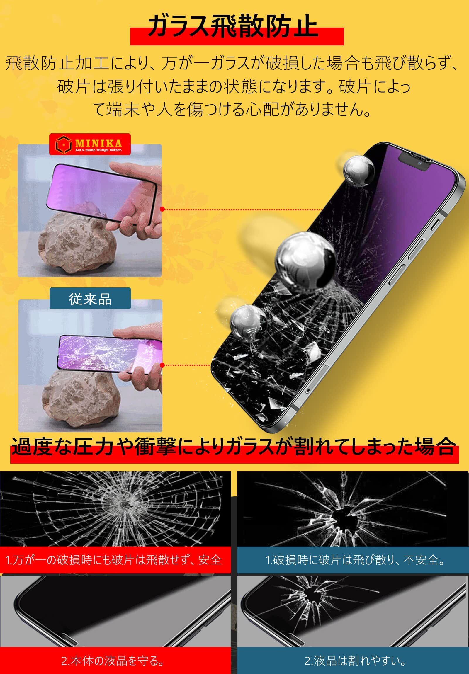 【保護力3倍Up】 MINIKAのいphone14 液晶保護フィルム一般的な製品に比べ3倍以上の保護力があり、画面の破損を最低限まで抑え、衝撃を受けても割れにくい。優れた耐スクラッチ性能:高硬度のフィルムが日常的なスクラッチから守り、傷を付きにくくします。