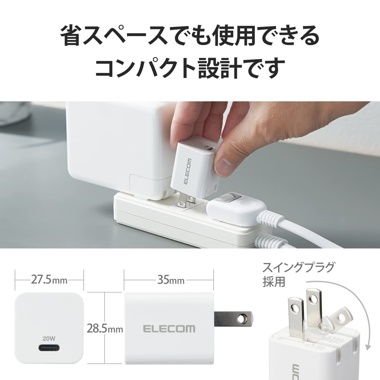 エレコム USB PD対応 20W 充電器 Type-C×1ポート ケーブル付き(C-C/1.5m) 小型 コンパクト 折りたたみ式プラグ採用 コンセント 【iPhone 16 15 iPad Android 各種対応】 ホワイト EC-AC17WH