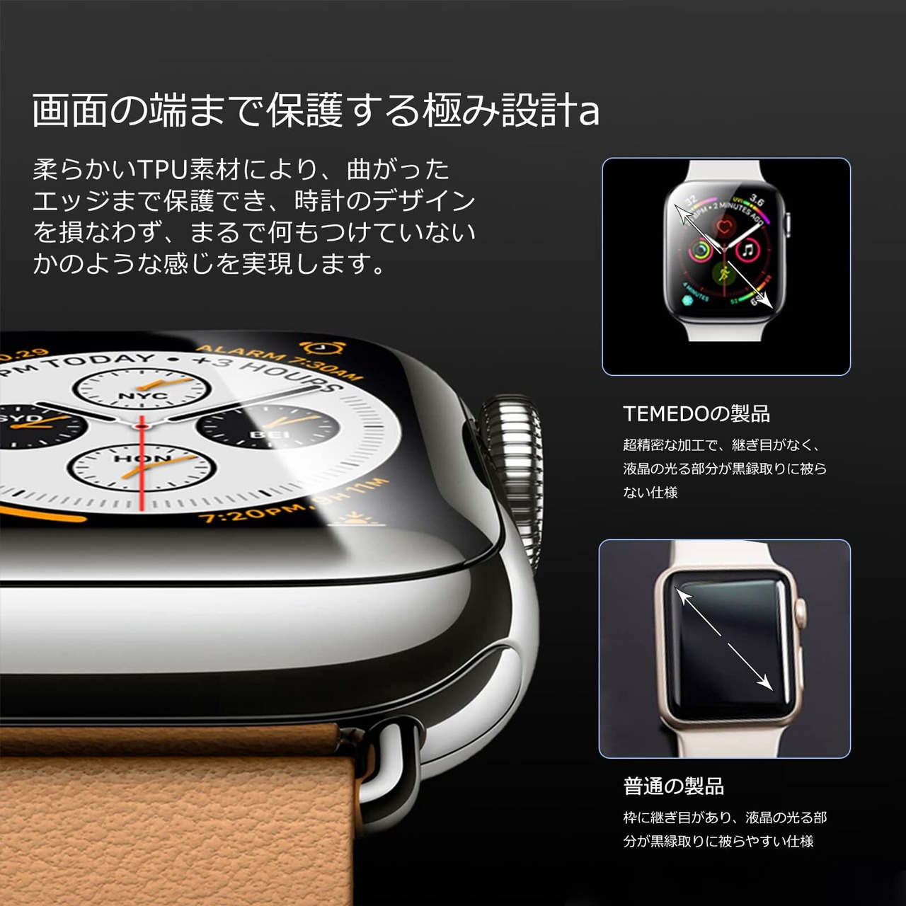 高透過率:超精密な加工が施されていて、液晶の光る部分が黒縁取りに被らない仕様です。透過率は99%超えるため、画面の視認性とタッチ感が優れ、液晶画面を鮮やかに彩ります 、Apple Watch本来の美しさを損ないません。
