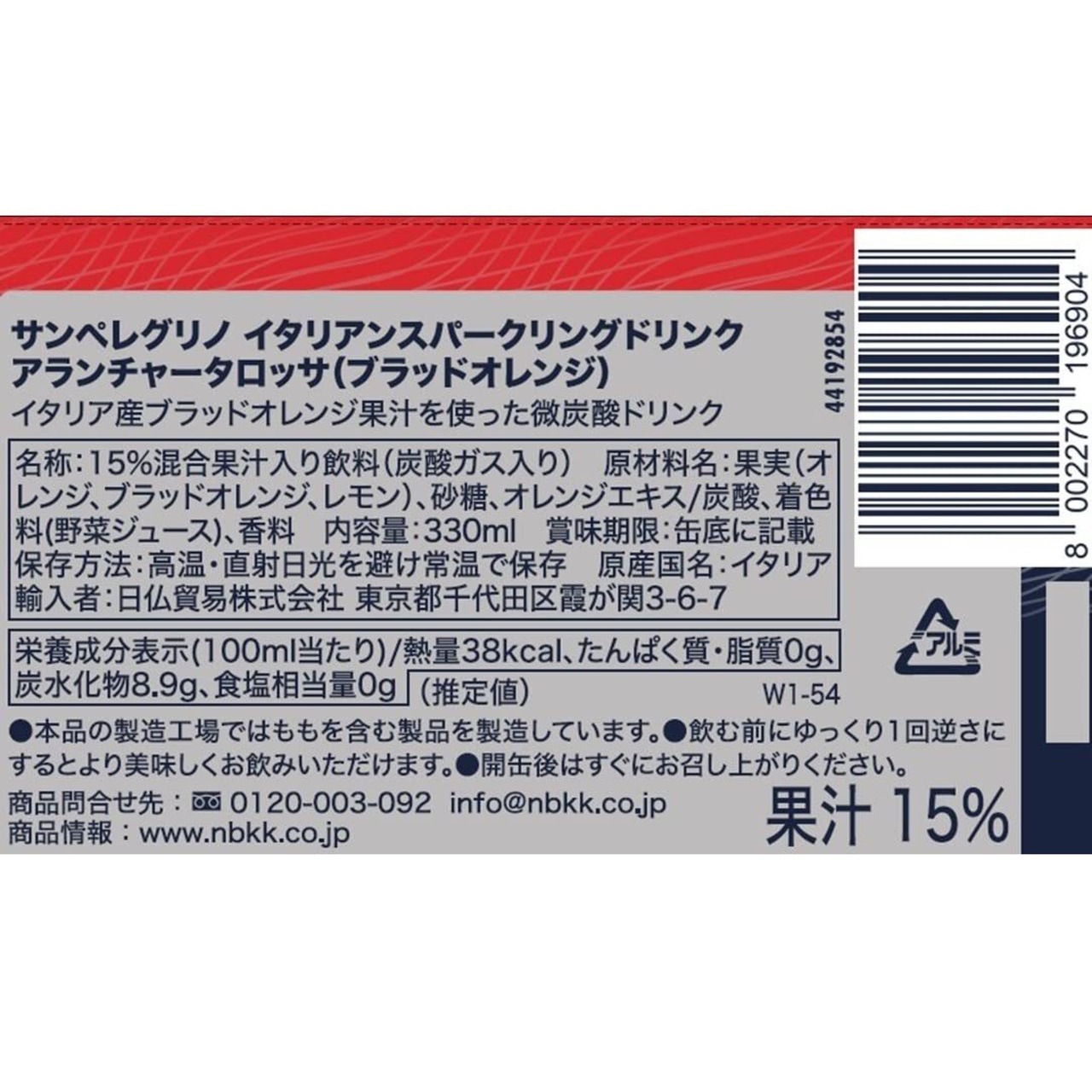 【原材料】果実(オレンジ、ブラッドオレンジ、レモン)、砂糖、オレンジエキス/炭酸、着色料(野菜ジュース)、香料 【原産国】イタリア