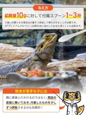【 ふわっふわ極微細パウダーで効率良く摂取! 】極微細にこだわったふわふわなカルシウムパウダーはワーム・コオロギ等の活き餌にしっかりまぶすことができ、逃げ回る間も落ちにくいです●レオパゲルやマルベリックドライなど人工餌にふりかける。●フトアゴやかめのえさの生野菜にふりかける●毎日のごはん総量に対し、1%~3%を目安にお与えください。※野菜10gの場合、付属スプーン1杯分(0.1g)~3杯分