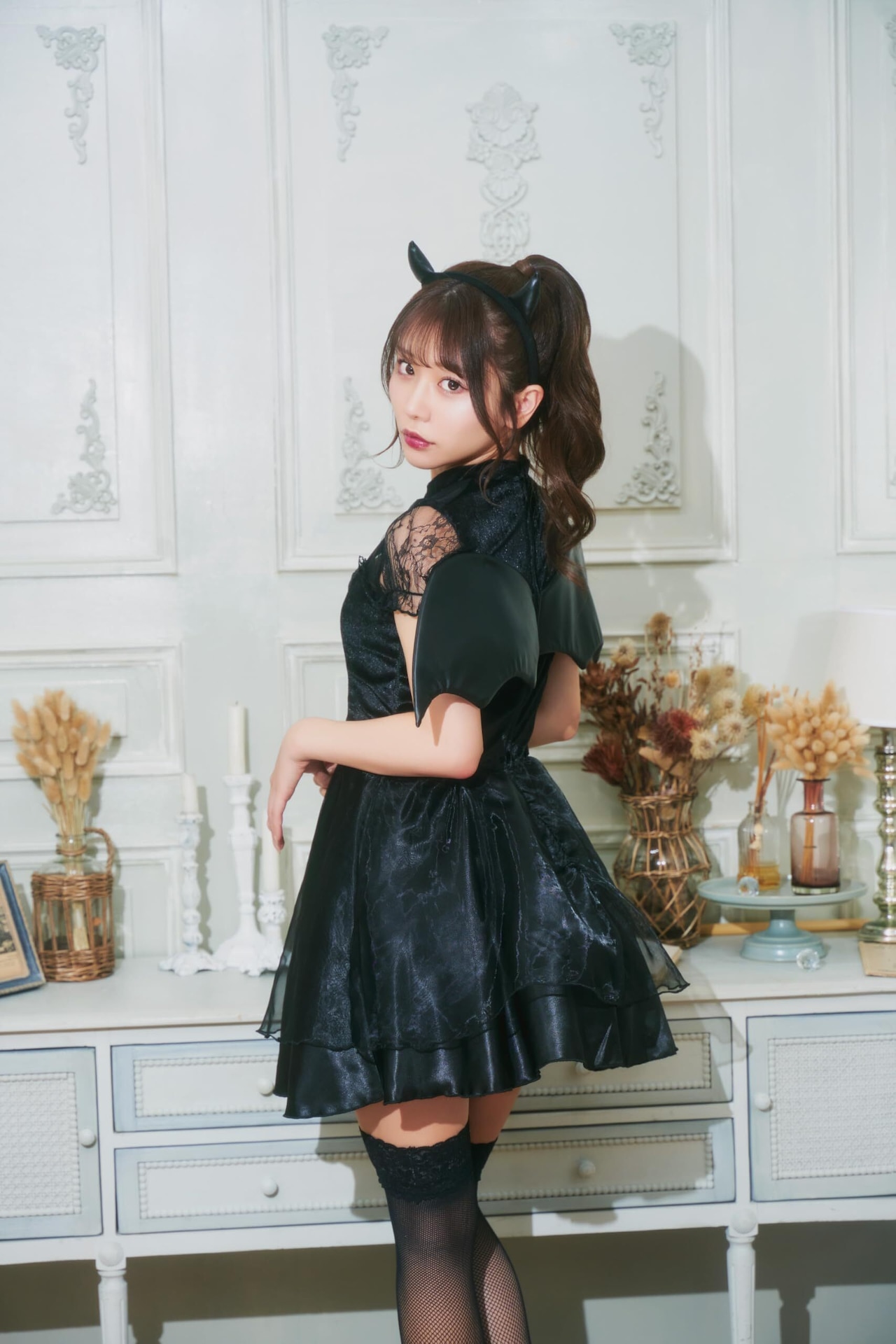 胸元開きやレース、シースルー素材を使った大人可愛いデビルコスチューム。