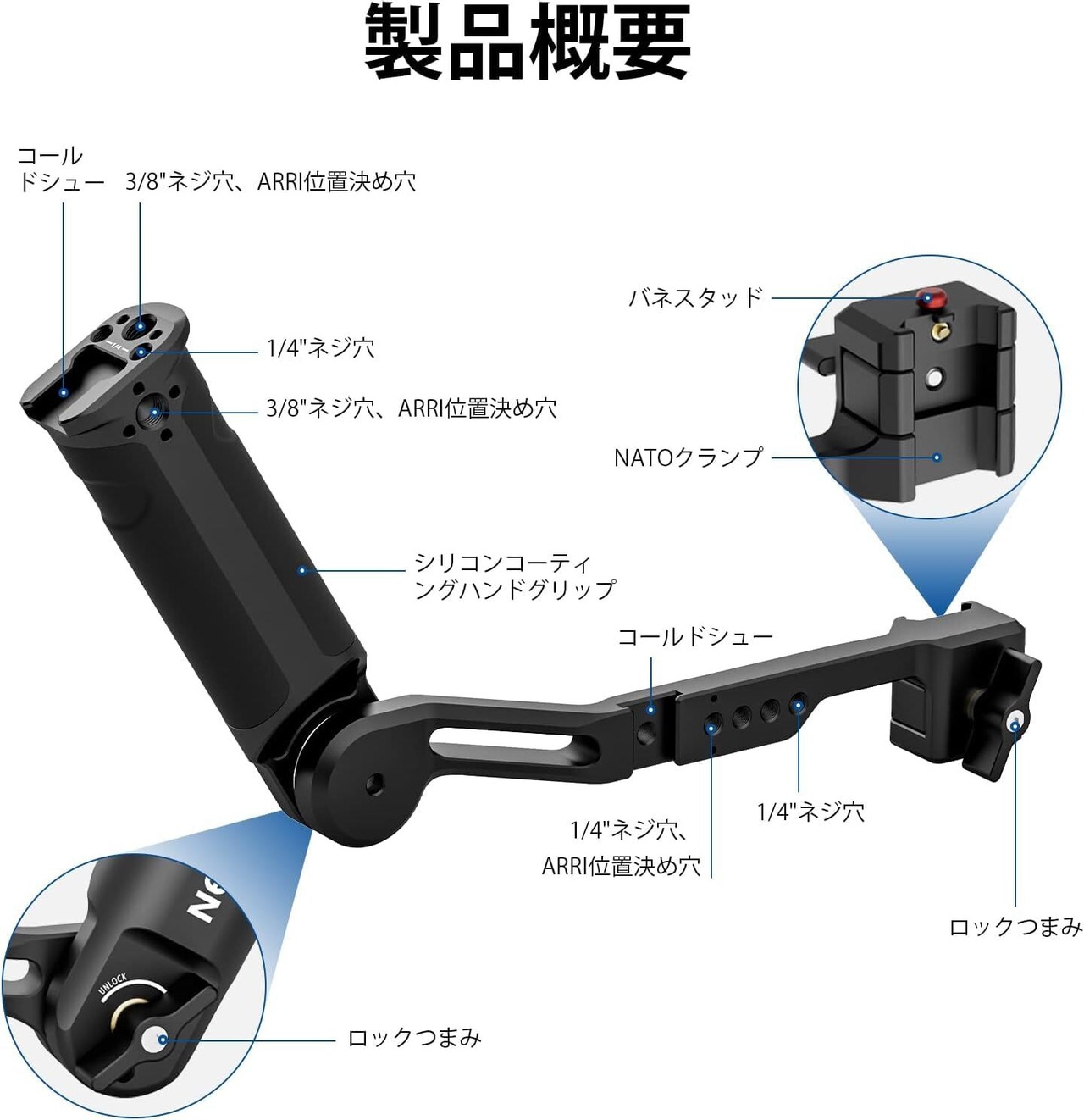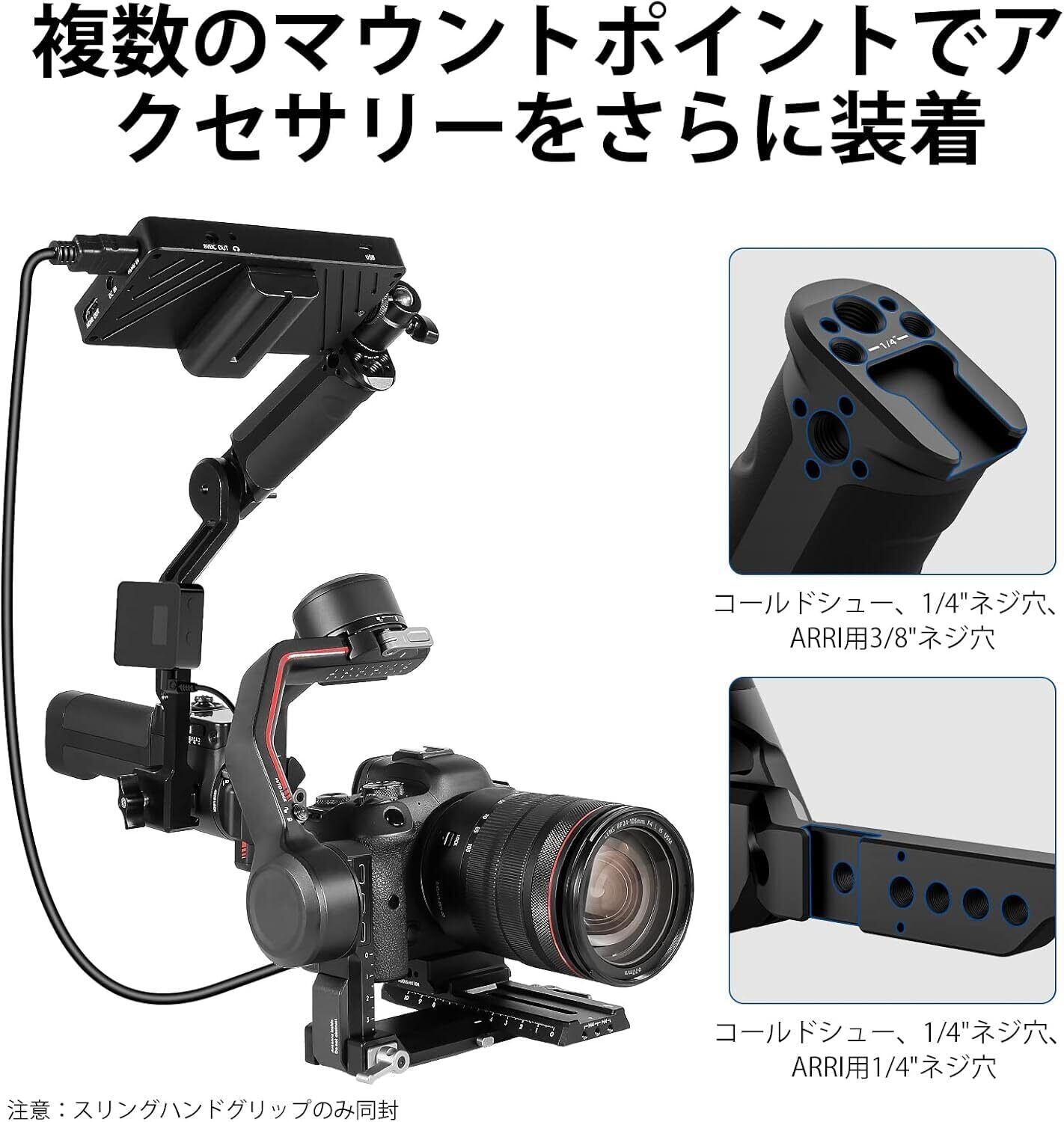 【複数の取り付けオプション】スリンググリップには、複数の1/4"と3/8"ネジ穴、ARRIピンに対応できる位置決め穴、2 つのコールド シュー アダプターが備えており、LEDライト、サウンドレシーバー、モニターなどさまざまなアクセサリーを取り付けることができます。