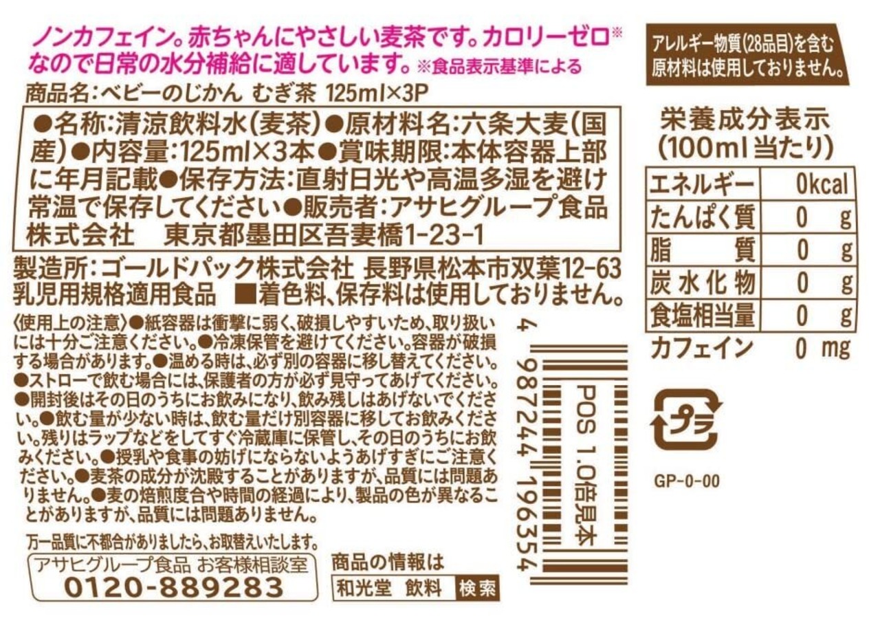 ●紙容器は衝撃に弱く、破損しやすいため、取り扱いには十分ご注意ください。●冷凍保管を避けてください。容器が破損する場合があります。●温める時は、必ず別の容器に移し替えてください。●ストローで飲む場合には、保護者の方が必ず見守ってあげてください。●開封後はその日のうちにお飲みになり、飲み残しはあげないでください。●飲む量が少ない時は、飲む量だけ別容器に移してお飲みください。残りはラップなどをしてすぐ冷蔵庫に保管し、その日のうちにお飲みください。●授乳や食事の妨げにならないようあげすぎにご注意ください。●麦茶の成分が沈殿することがありますが、品質には問題ありません。●麦の焙煎度合や時間の経過により、製品の色が異なることがありますが、品質には問題ありません。