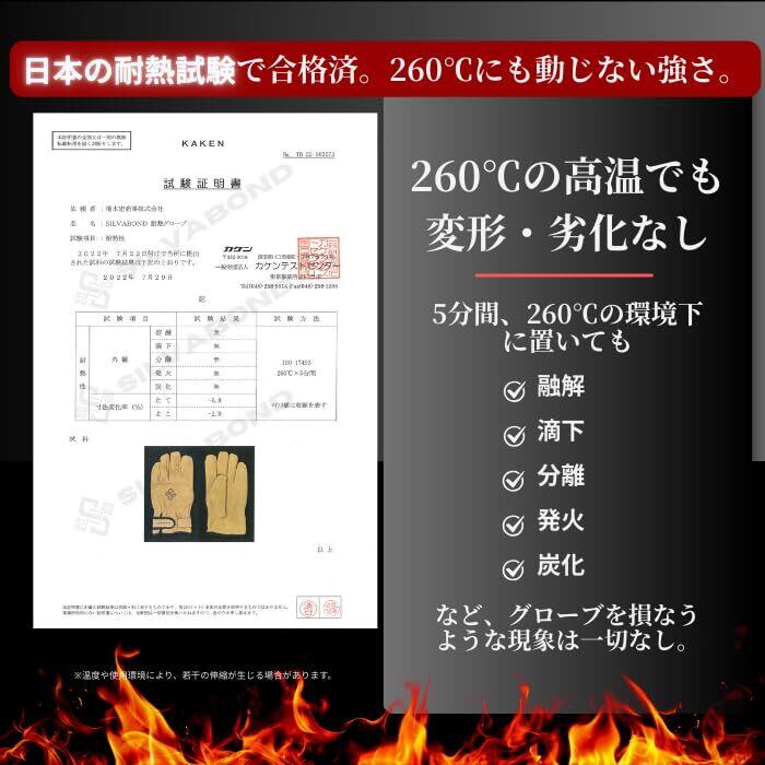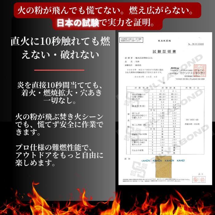 【日本耐熱試験合格】防火服でも行う耐熱性、熱伝達性試験を実施。260℃の熱風循環炉に5分間放置しても外観上の変化は無し。BBQ、スキレット、鍋つかみ、熱くなったシェラカップ等に使うのに最適です。プロのスペックをスタイリッシュな見た目で。