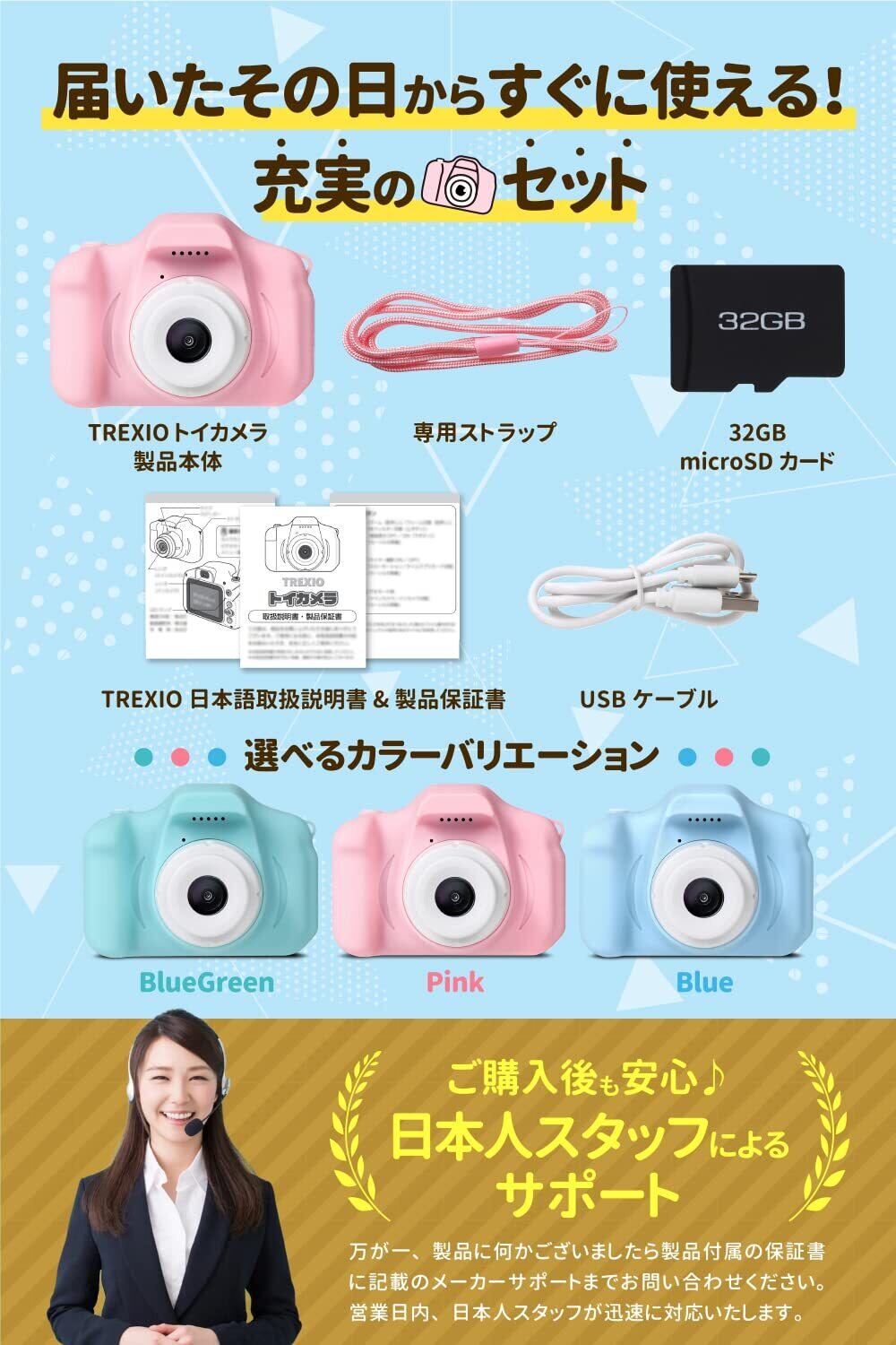 【 こどもでも扱いやすい軽量&コンパクト設計! 】重さはたったの約63g!サイズもこどもの手に最適なコンパクト設計になっています! 【 届いたその日からすぐに使える充実のセット! 】セット内容: TREXIOトイカメラ製品本体×1、32GB microSDカード×1、専用ストラップ(紛失や落下防止用)×1、TREXIO日本語取扱説明書&製品書×1、専用USBケーブル×1 【 3色のカラーバリエーション 】「ピンク」と「ブルー」、「ブルーグリーン」の3色より、お好みの色をお選びいただけます! 【 購入後も安心 “充実したサポート“ 】 初めての使用でも安心の「日本語取扱説明書/メーカー書」が付属。また、万が一の初期不良の場合はご購入後30日以内であれば返品・返金可能!付属の製品書に記載のメーカーサポート宛てにご連絡をいただければ日本人スタッフが迅速に対応いたします!