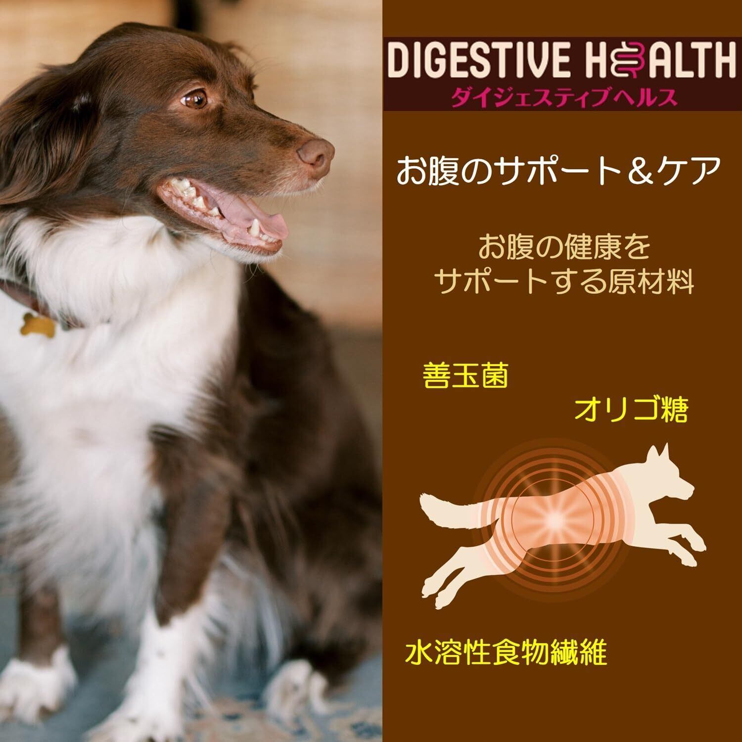 犬の祖先は肉食であるという栄養学的哲学をもとに、消化に優れた厳選した原材料を使用し、高消化性に設計した、愛犬の消化管の健康をサポートする製品です。お腹の健康を保つことで、本来の免疫力が維持され、健康的な皮膚・被毛が保たれ、健康的な硬さの便(個体差があります)が排泄されます。