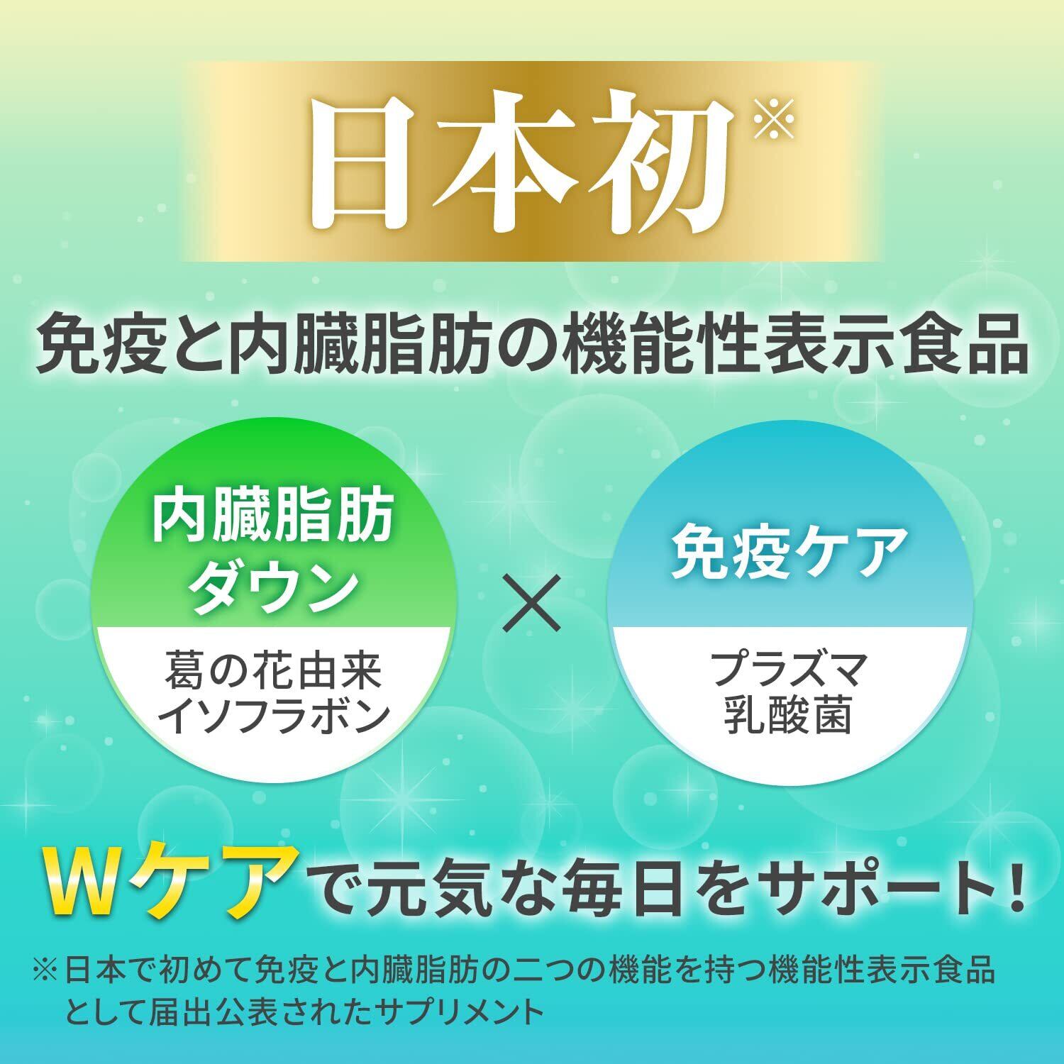 【機能性関与成分】プラズマ乳酸菌(L. lactis strain Plasma)1,000億個、葛の花由来イソフラボン(テクトリゲニン類として)22mg、【届出表示】本品には、プラズマ乳酸菌(L. lactis strain Plasma)が含まれます。プラズマ乳酸菌はpDC(プラズマサイトイド樹状細胞)に働きかけ、健康な人の免疫機能の維持に役立つことが報告されています。 本品には、葛の花由来イソフラボン(テクトリゲニン類として)が含まれます。葛の花由来イソフラボン(テクトリゲニン類として)には、肥満気味な方の、体重やお腹の脂肪(内臓脂肪と皮下脂肪)やウエスト周囲径を減らすのを助ける機能があることが報告されています。