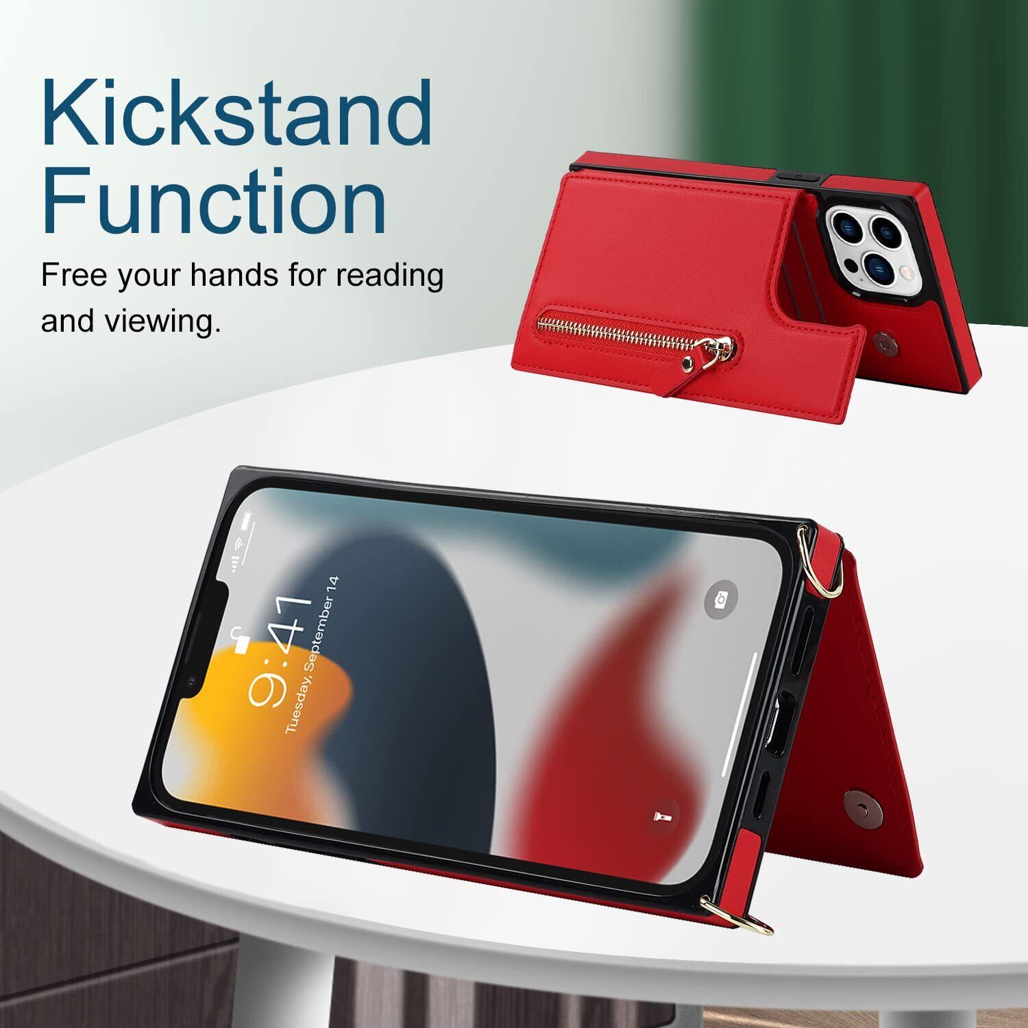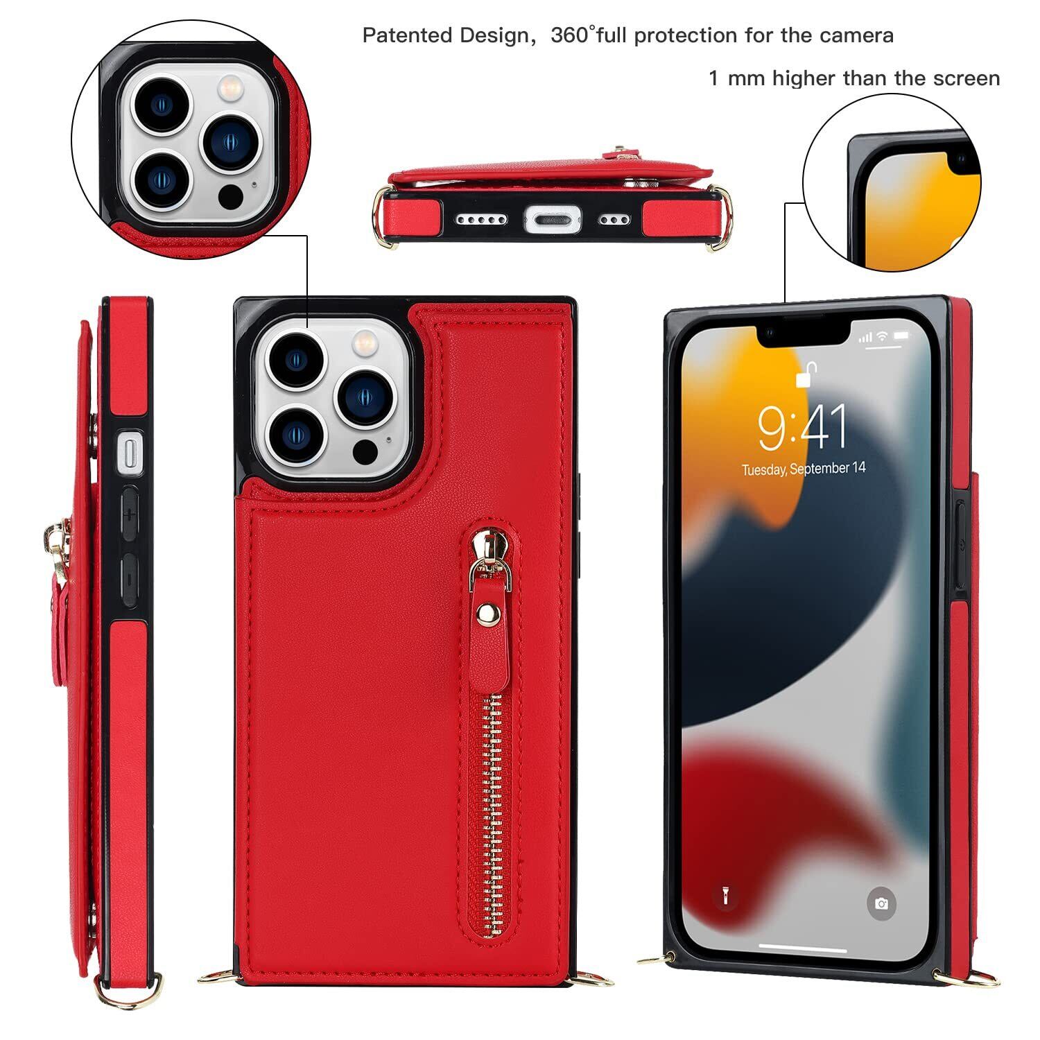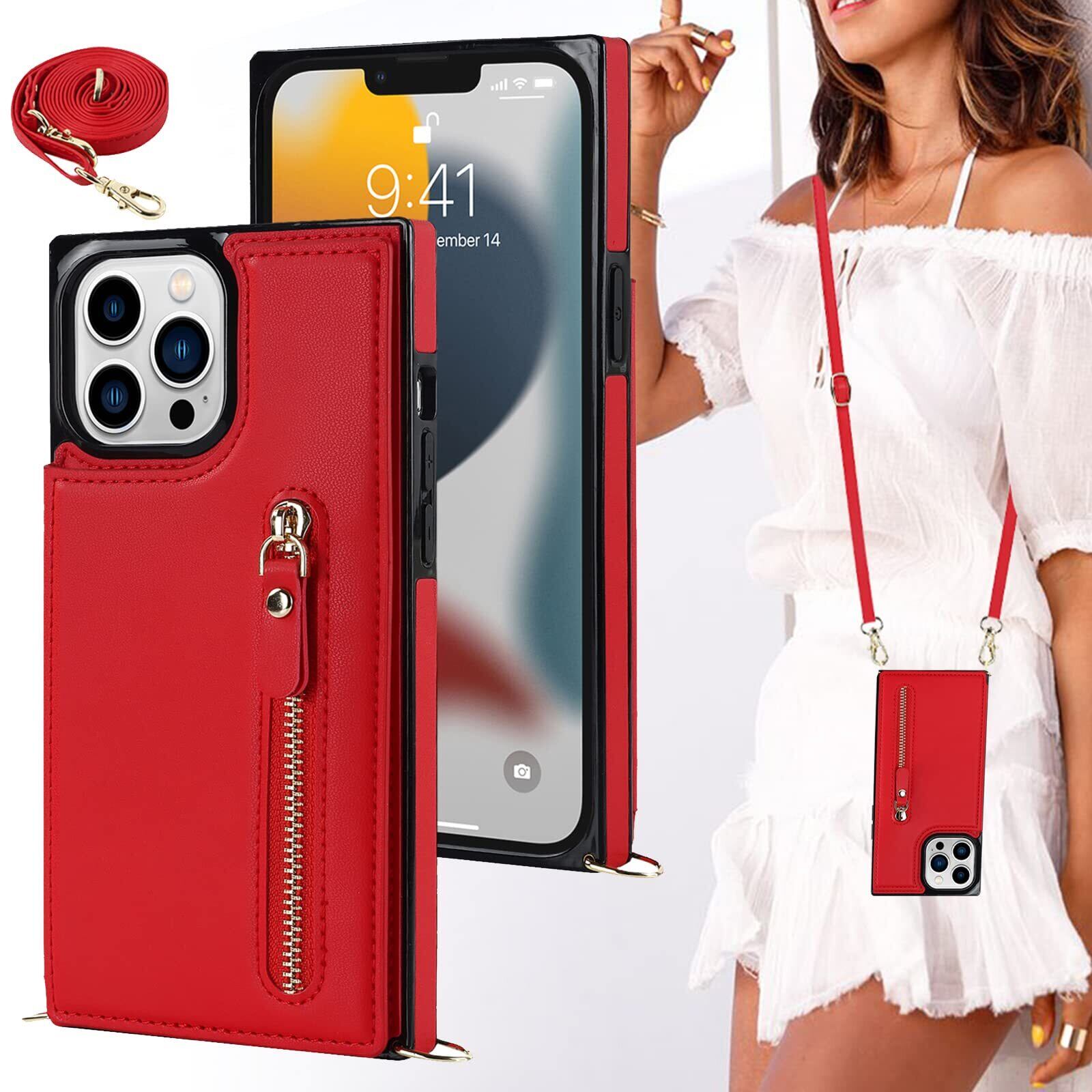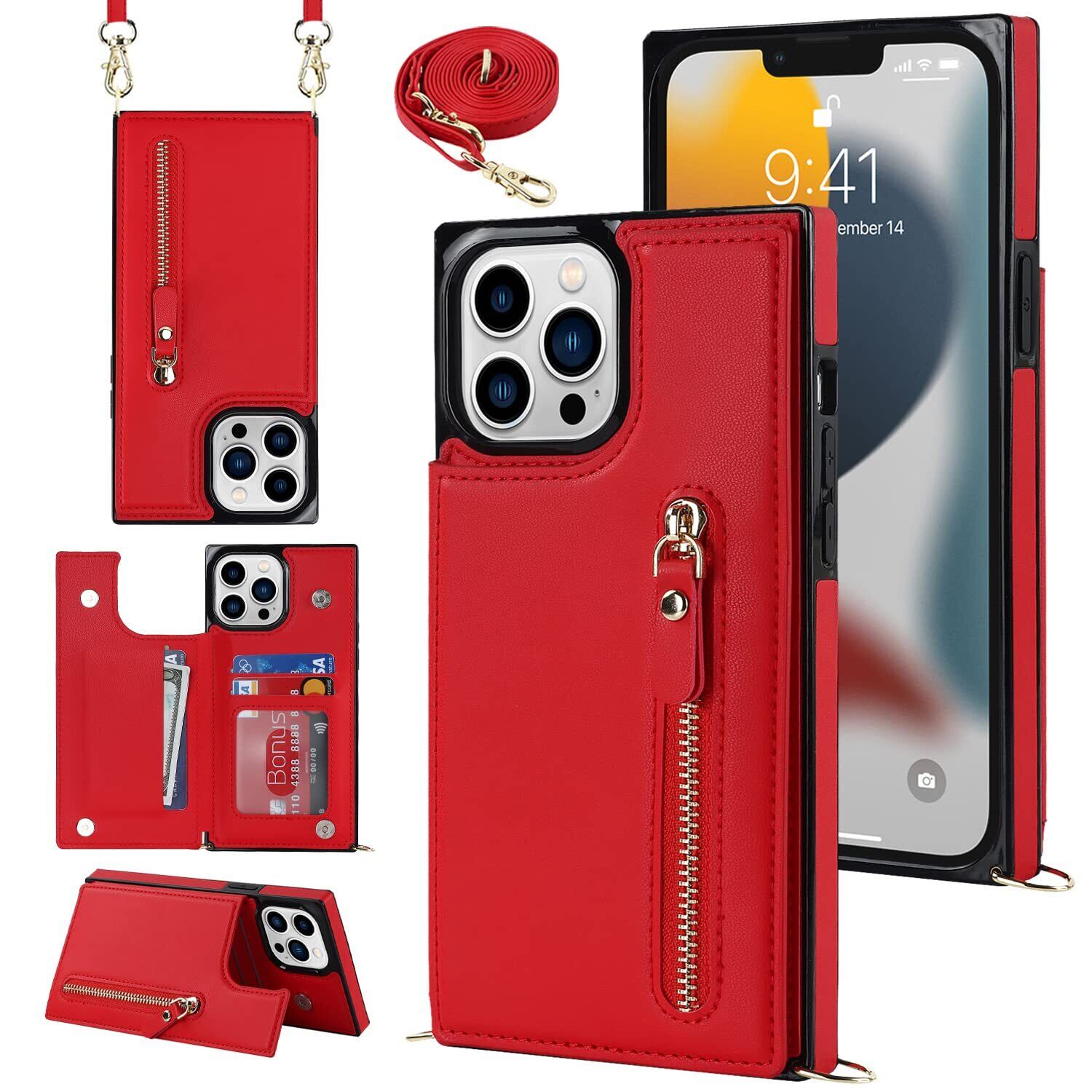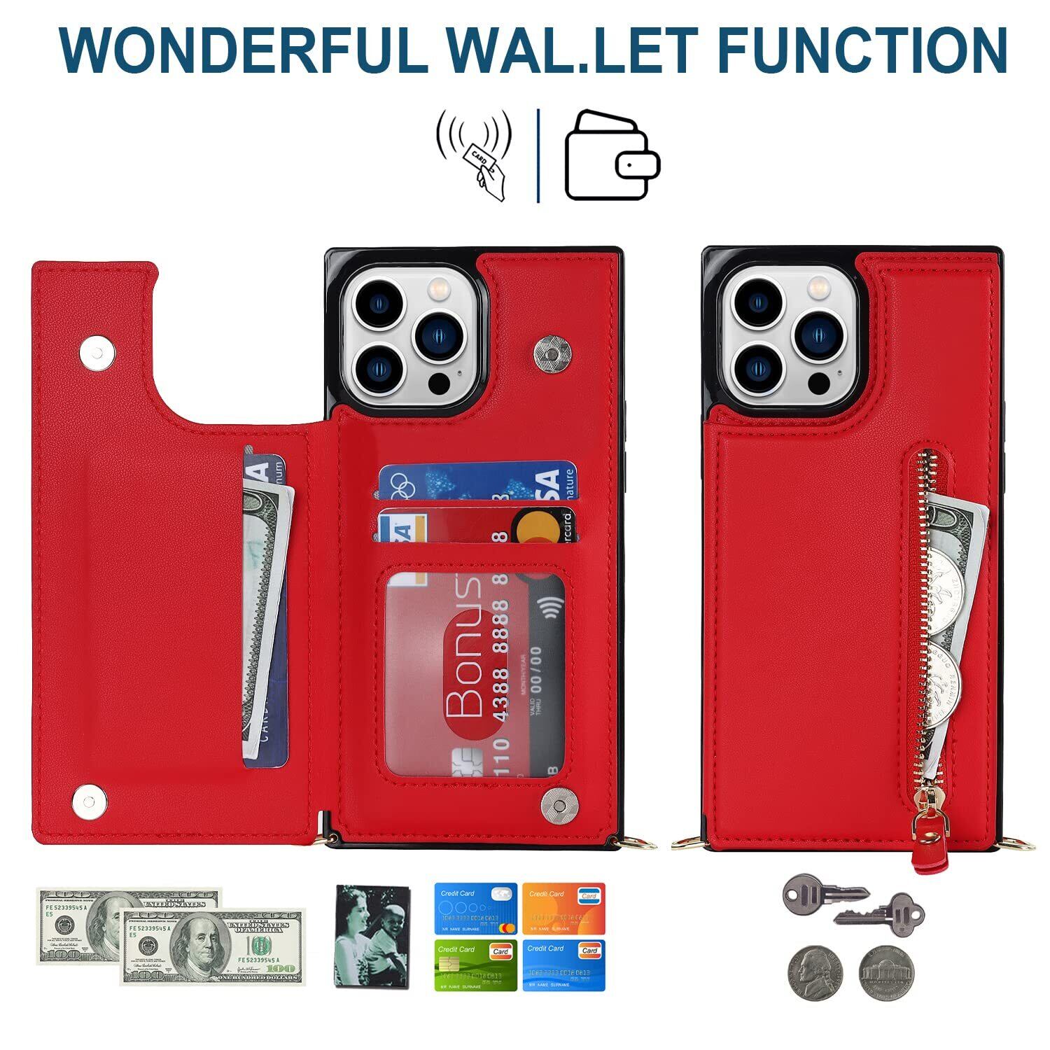 iPhone 13 Pro Max ケース 背面 フリップ 手帳型 ショルダー ストラップ 紐付き クロスボディ アイフォン 13 プロ マックス スマホケース アイホン 13プロmax 手帳ケース アイホン13 pro Max 携帯カバー アイフォン13プロマックス ケースカバー 適用 【BonwFzin】 RFID防止 肩がけ 首掛け 斜め掛け 小銭入れ ファスナー カード入れ レッド