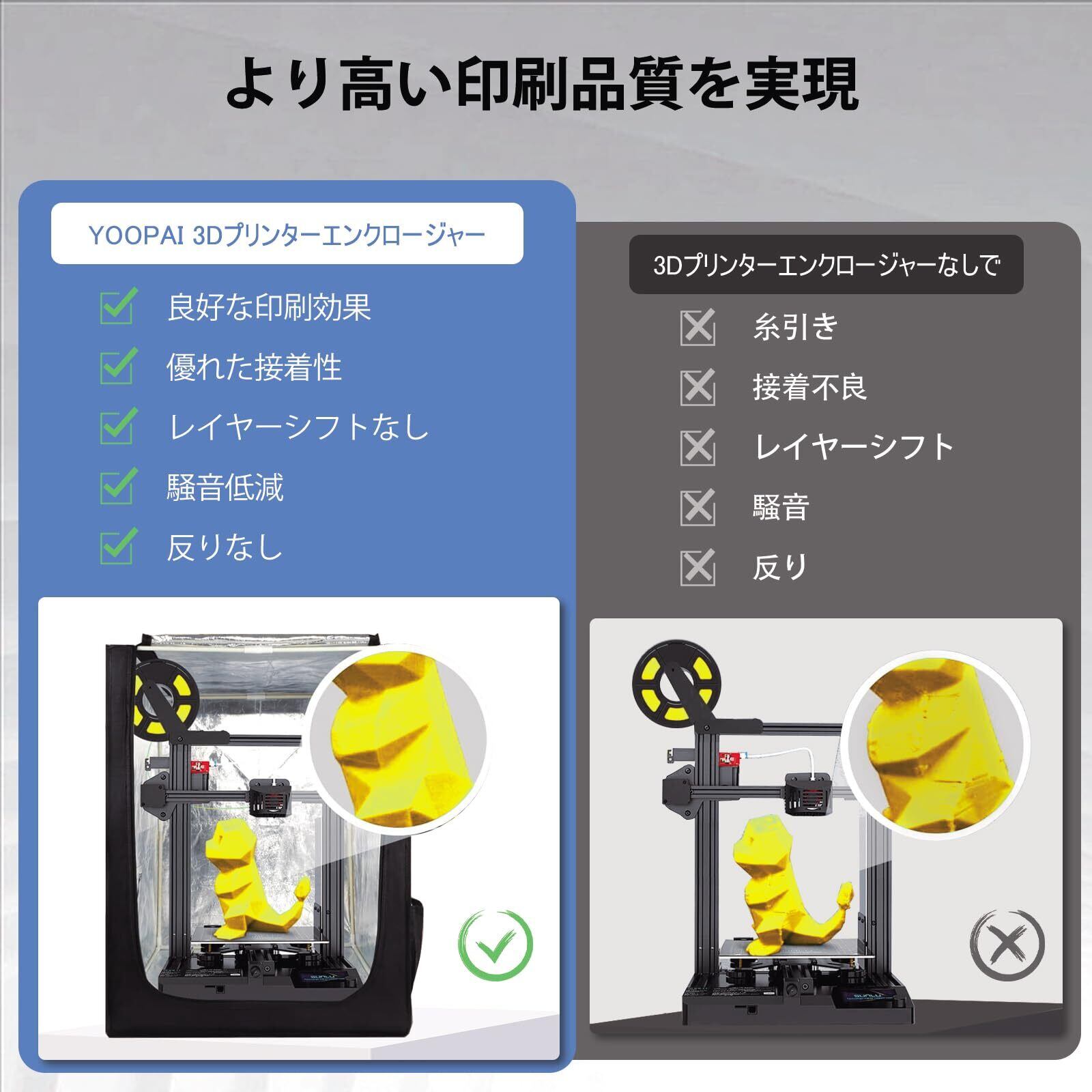 【防水 防湿 ノイズ低減】ボックスの内部を乾燥した状態に保ち、材料の吸水による気泡やひび割れや収縮などの状況を改善します。密閉されたビルド チャンバーは、印刷中のノイズを効果的にブロックします。