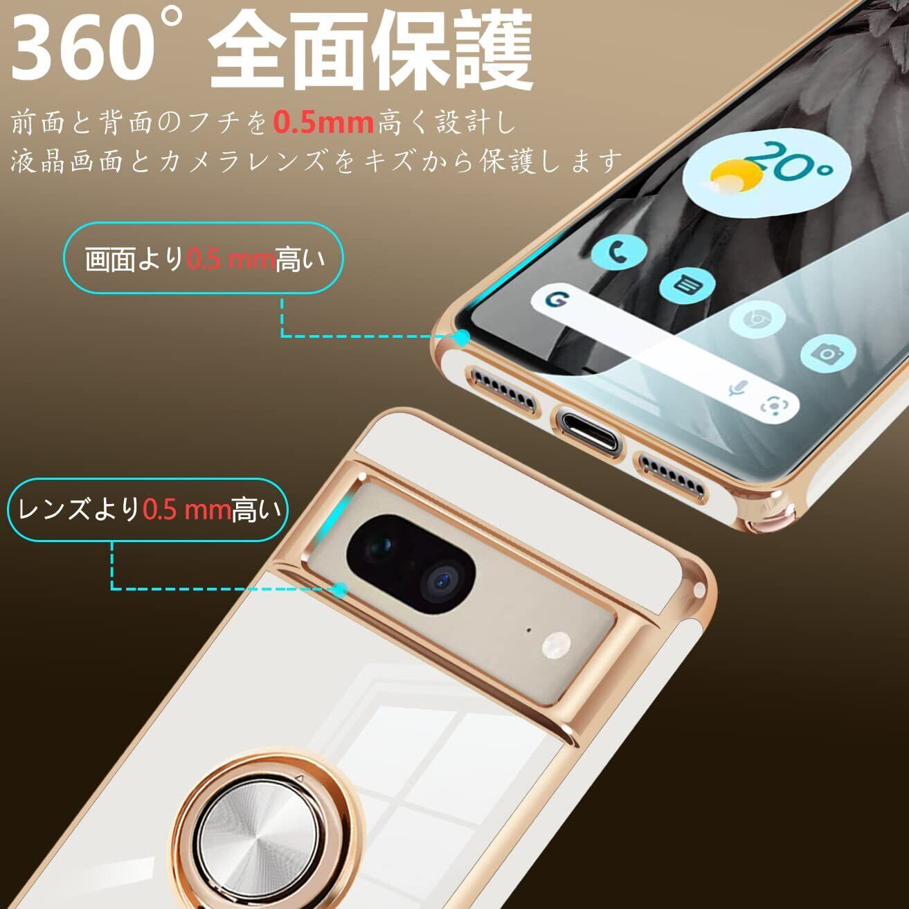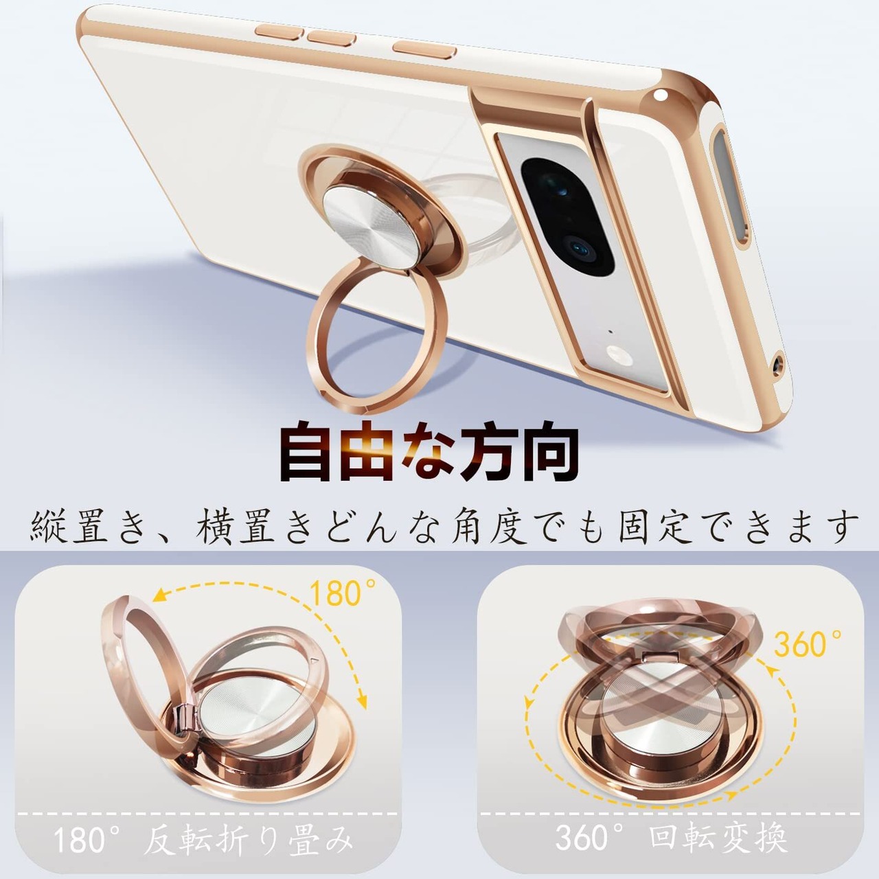 Google Pixel7 ケース リング付き グーグル ピクセル 7 リング カバー 耐衝撃 TPU メッキ加工 360°回転 スタンド機能 車載ホルダー ストラップホール付き(ホワイト)