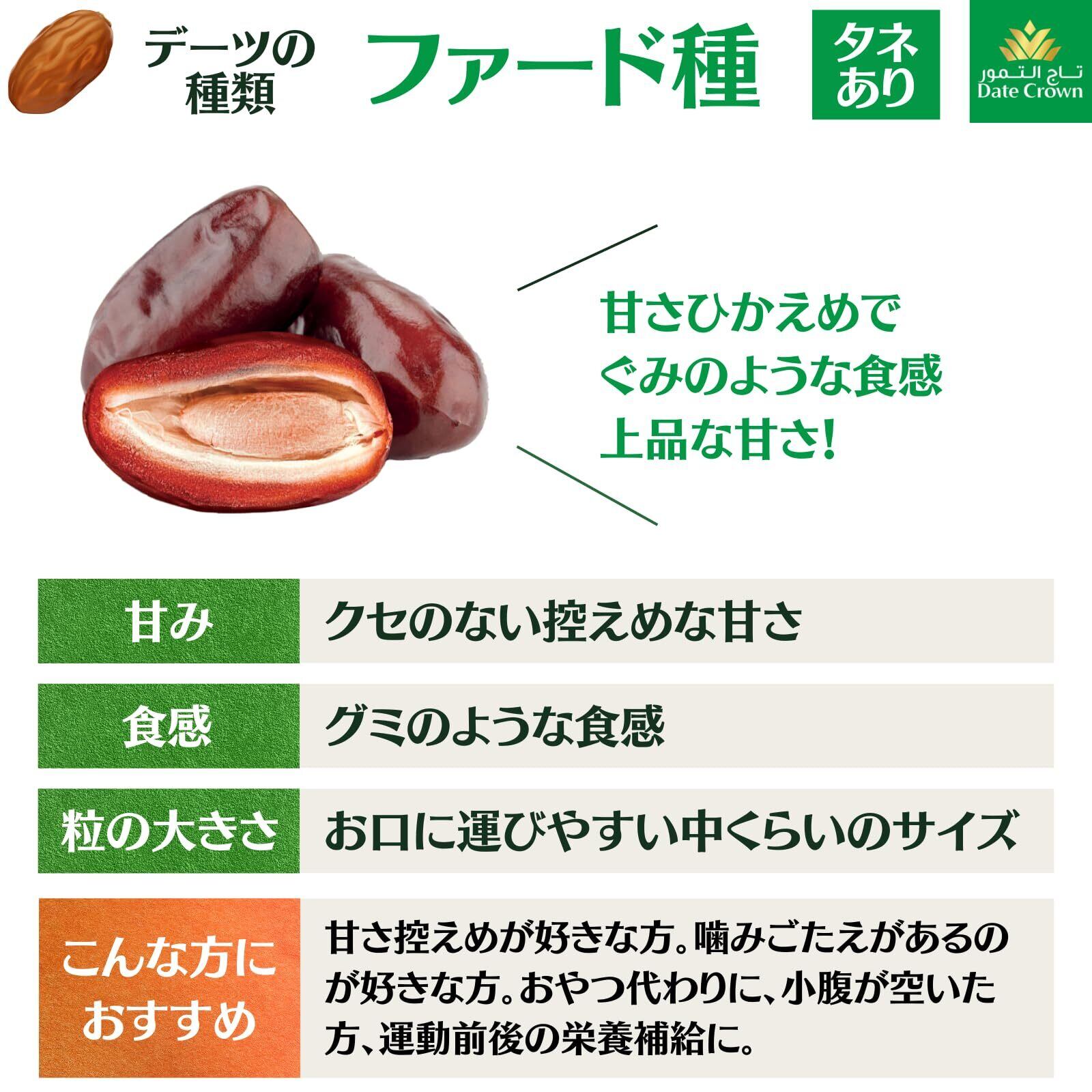 【ファード種】グミのような食感と甘さ控えめが特徴のファード種。噛むと上品なくせのない甘さが口に広がります。中東では、お菓子のタフィーのような味がするデーツとして親しまれています。上品な甘さとしっかりとした噛み応えの食感を楽しみたい方にオススメです。