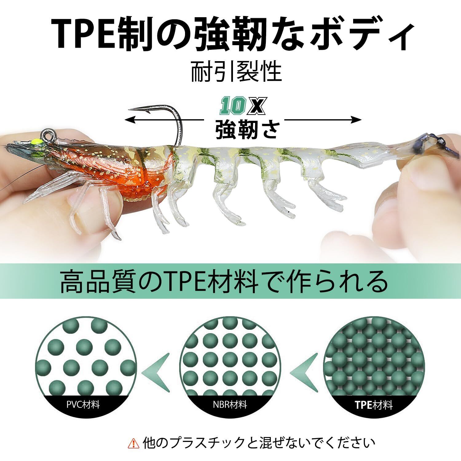 【高品質のTPE素材で作り】TRUSCENDのエビ型・ルアーは、性能と見た目を両立させるために高品質のTPE素材を使用している。このエギのボディーは非常に強靭で、壊れにくく、大物の強いバイトに耐えることができるだけでなく、澄んで非常に見栄えの良い見た目を持っている。