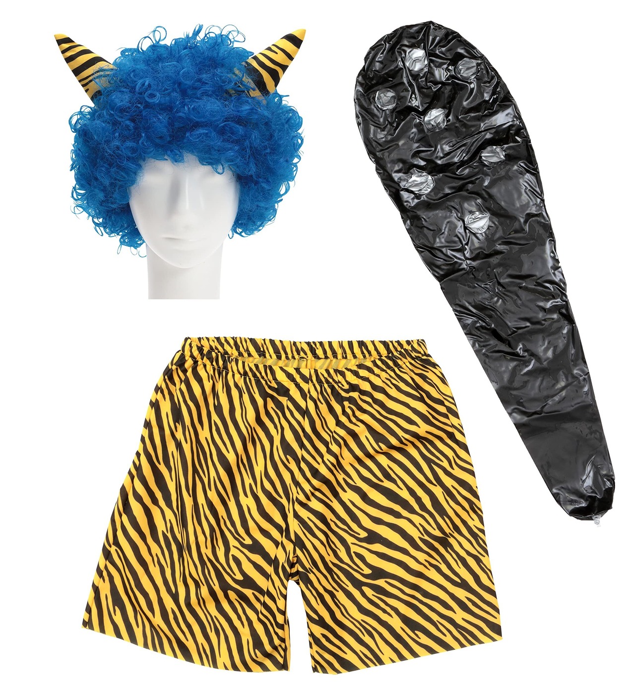 青い角付きウィッグ、トラ柄パンツ、大迫力のどデカこん棒の充実3点セット!