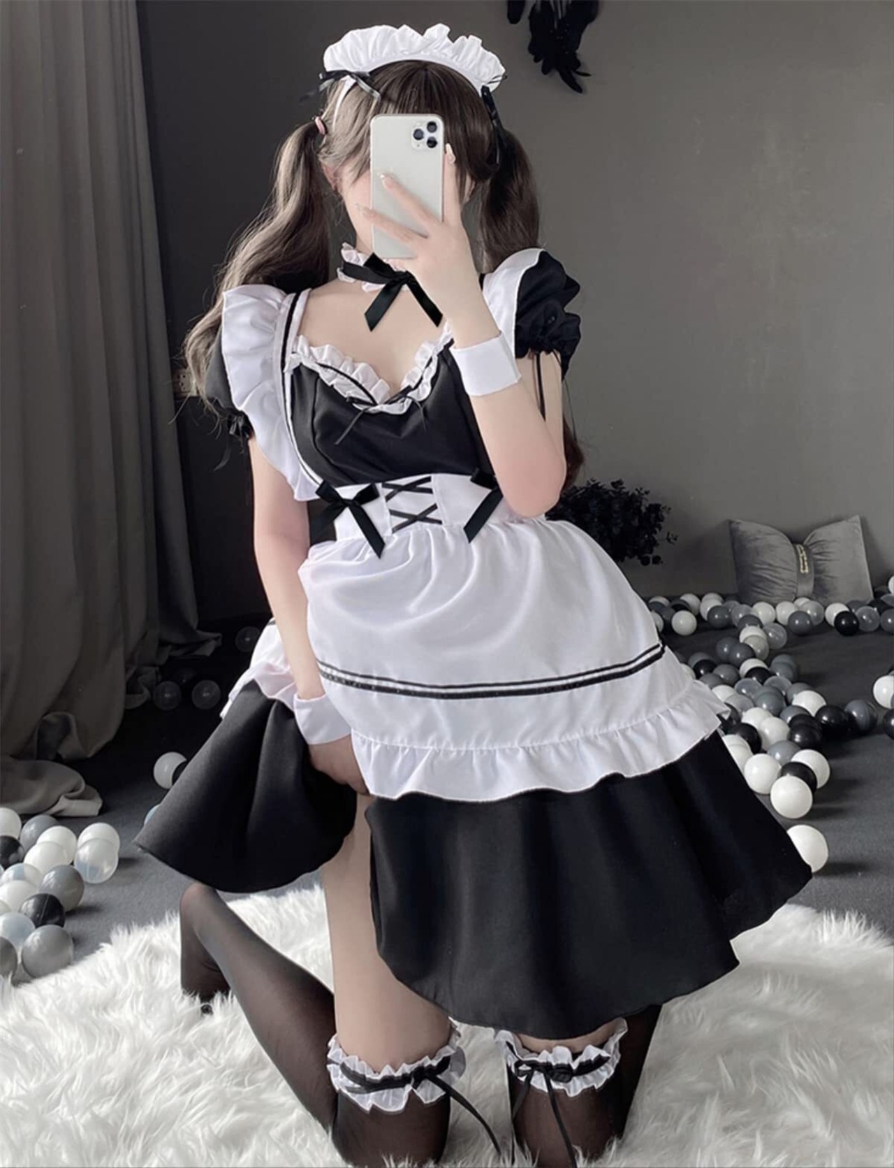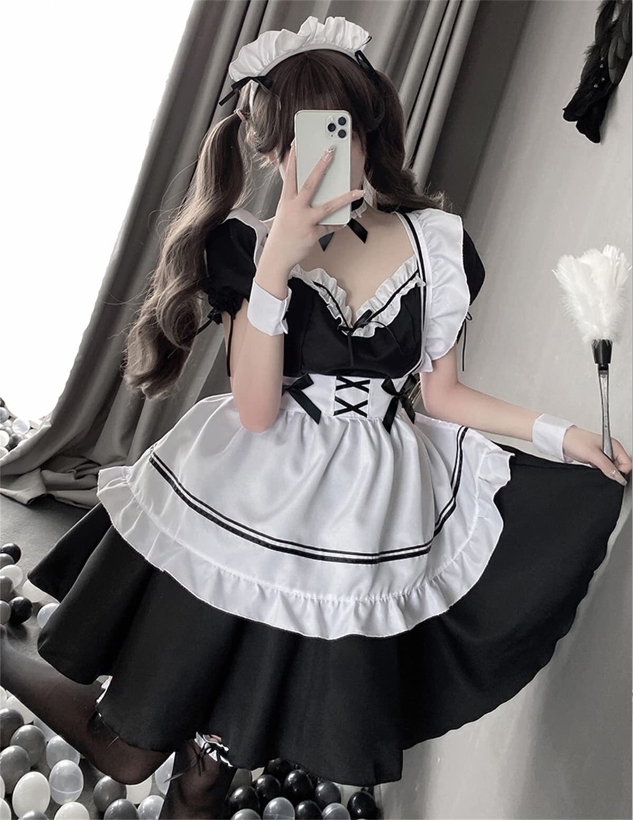 【セット内容】:ワンピース、エプロン、カチューシャ、チョーカー、カフス(腕)*2、ガーターリング(片太もも)*2