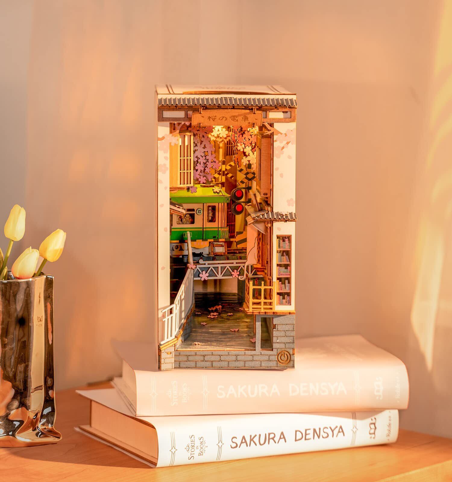 Rolife DIY ブックヌック 桜の電車 立体パズル ミニチュアハウスキット ブックエンド 本立て LED 本棚装飾 手作りキット 組み立て 木製パズル ウッドクラフト イラスト説明書付き TGB01 公式販売 大人向け 高学年向け プレゼントに最適