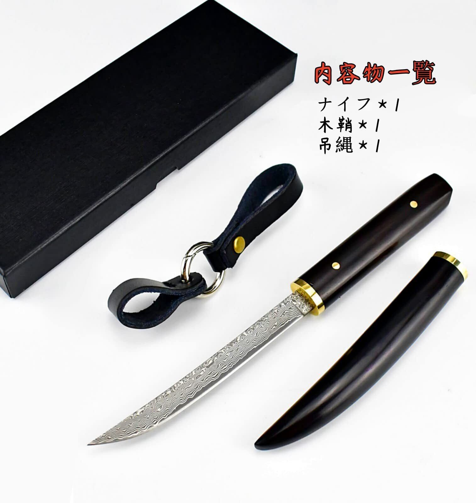 【内容物】ナイフ*1、木鞘*1、吊縄*1。当ナイフはアウトドア活動またはDIY、コレクションのみに使用することをおすすめです。