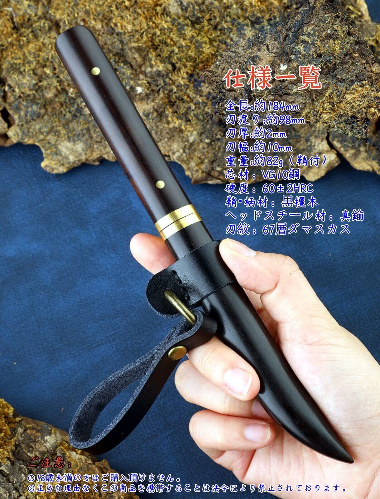 【ナイフの仕様】全長約184mm、刃渡り約98mm。刃身は芯材VG10鋼を使用し、硬度は60±2HRCに達し、67層のダマスカス刃紋が仕上げております。重量約82g(鞘付)。