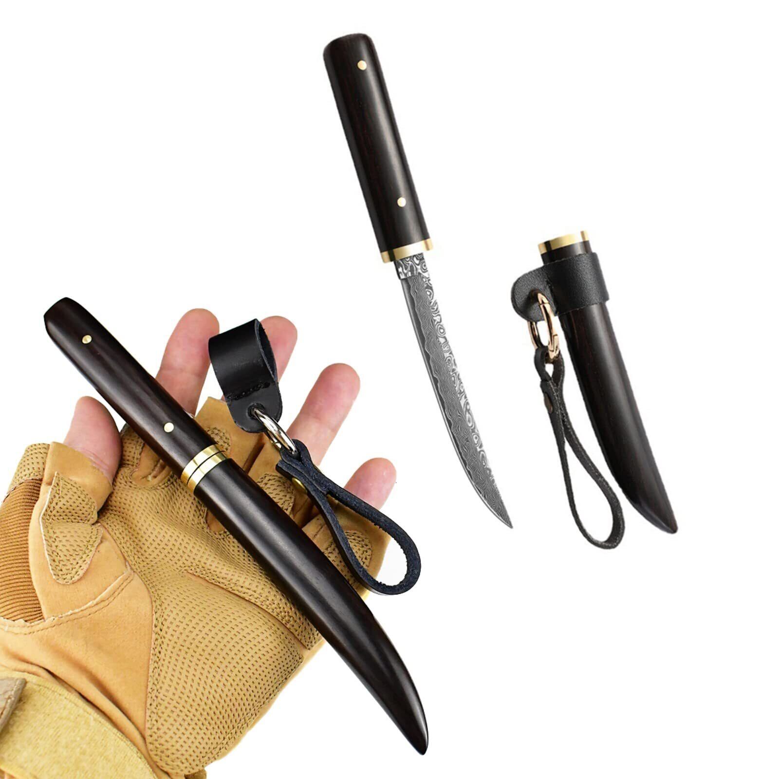 Irai Utakiシースナイフ アウトドアナイフ キャンプナイフ 魚釣り 登山 サバイバルナイフ ダマスカスナイフ 刃渡り約98mm 黒檀木ハンドル 鞘付