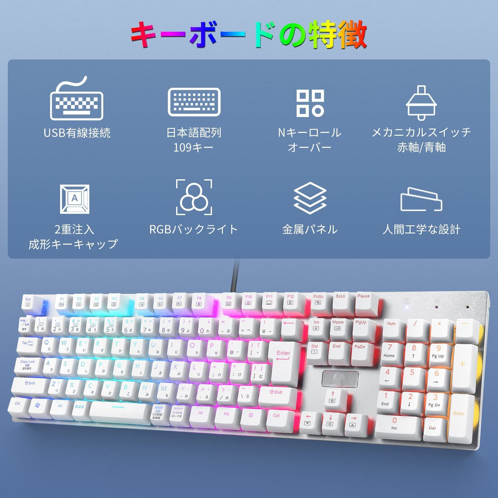【日本語配列】e元素メカニカル式ゲーミングキーボード 赤軸・青軸を採用 フルサイズ109キー Type-C USB有線接続 全キー防衝突 RGB発光LEDバックライト付き Windows/Mac OS対応 オフィス/ゲーム用JP配列キーボード (青軸・ホワイト)