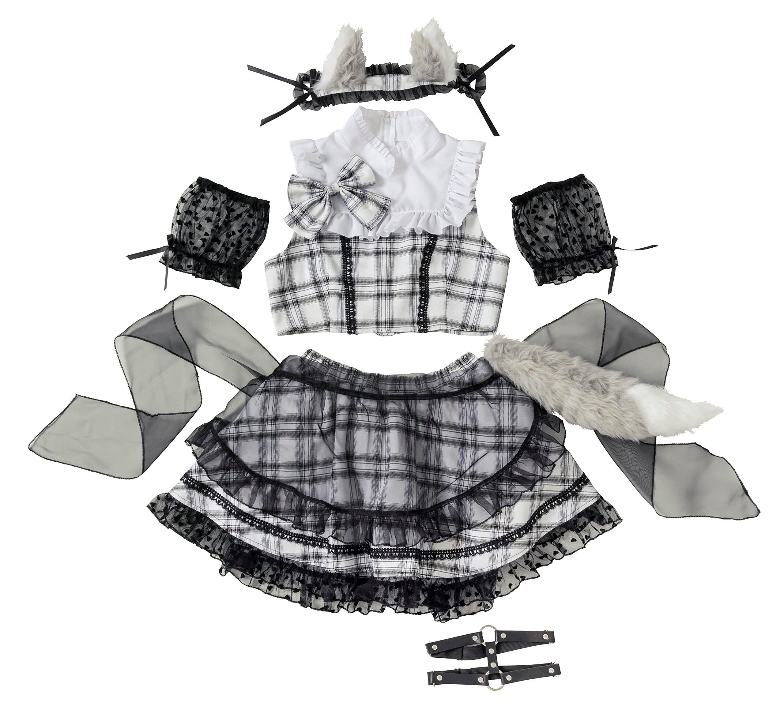 セット内容:ヘッドドレス、リボン、トップス、スカート、付け袖、エプロン、しっぽ、ガーター