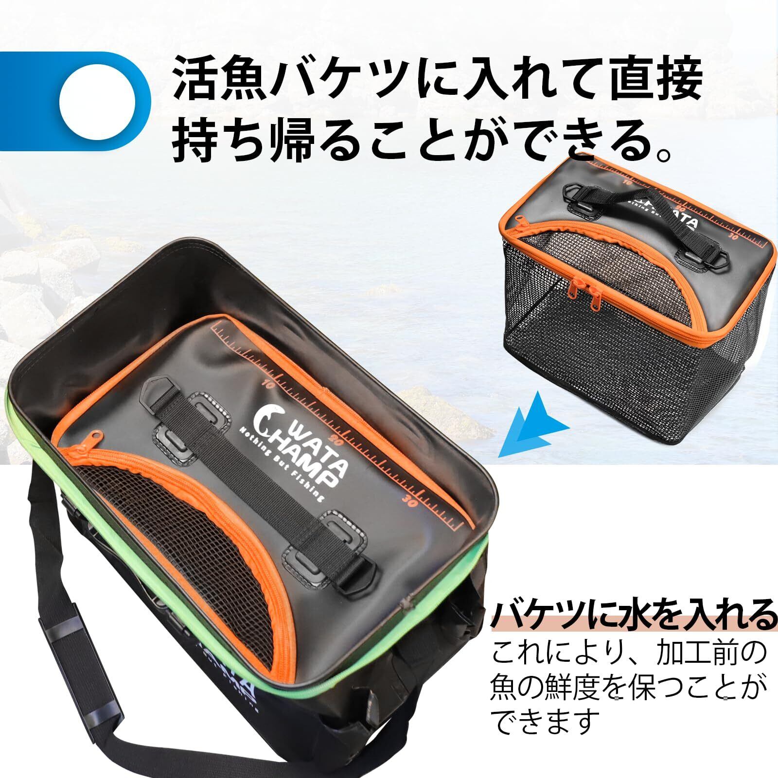 【折り畳み式 】✨ウレタンメッシュ側を内側にして半分に折り、ベルトのバックルを止めればコンパクトになります。 ✨ 高い耐久性-二重補強底メッシュ、内側耐摩耗ロープ、外側弾性ラテックス。魚の損傷を防ぎます ✨ 8mメートルロープが付属して、磯や波止場など様々なシーンで使用できるため汎用性も高く