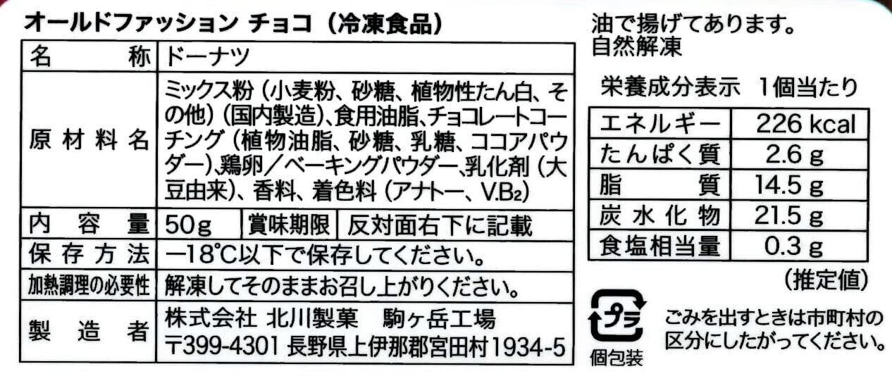 ミックス粉(小麦粉、砂糖、植物性たん白、その他)(国内製造)、食用油脂、チョコレートコーチング(植物油脂、砂糖、乳糖、ココアパウダー)、鶏卵/ベーキングパウダー、乳化剤(大豆由来)、香料、着色料(アナトー、V.B₂)
