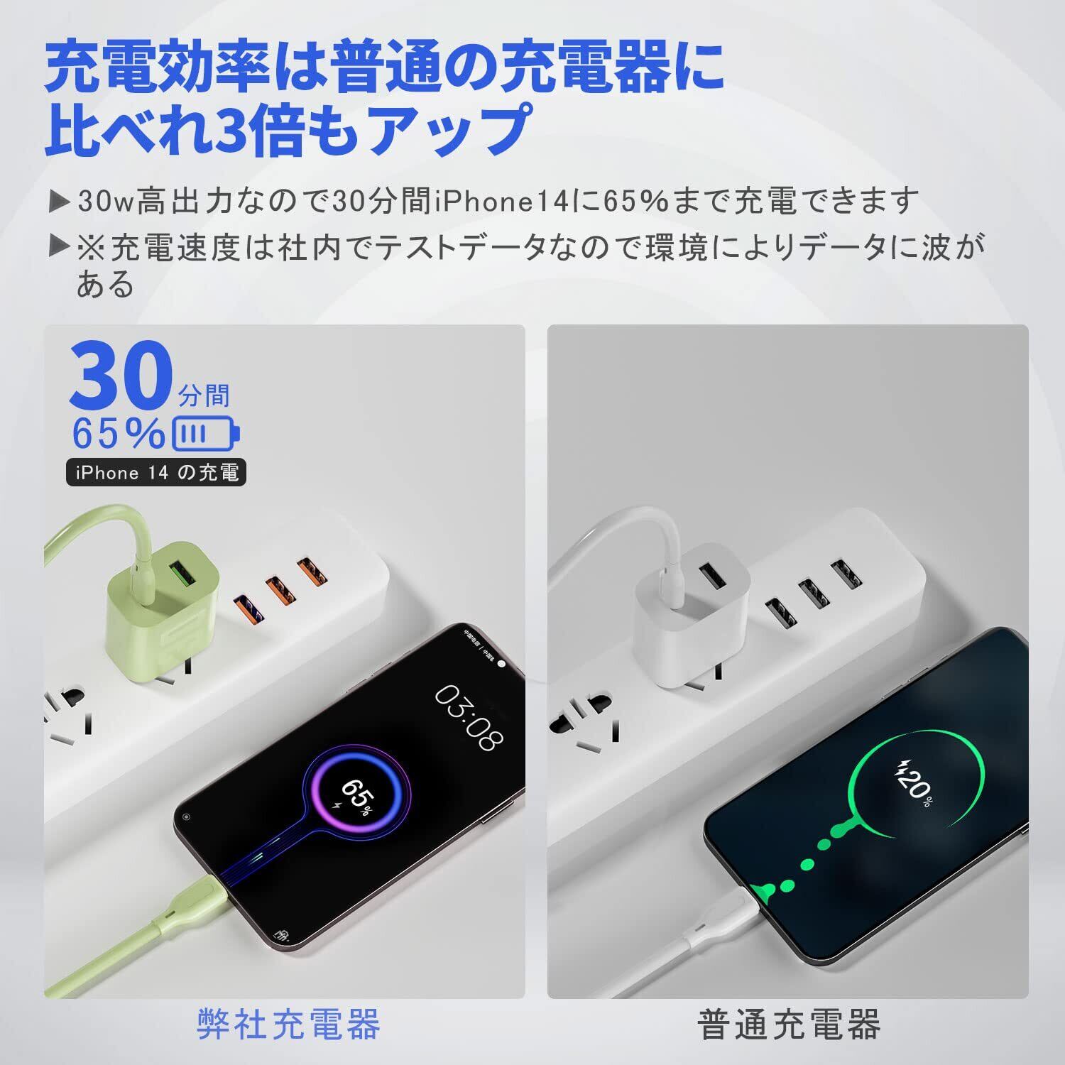 【急速充電対応】:本商品の単ポートは最大30Wの出力をサポートできます。iphone13に充電する場合は、普通の5W充電器より約3倍速く充電できます、満充電までは、約1時間ぐらいかかります。製品の性能を高めるため次世代パワー半導体素材「GaN」を採用して、高出力と低発熱と小型化などの優れた特徴を備えています。リズムが速い生活に従って従来の充電器からPD充電器までの革新技術を行った。