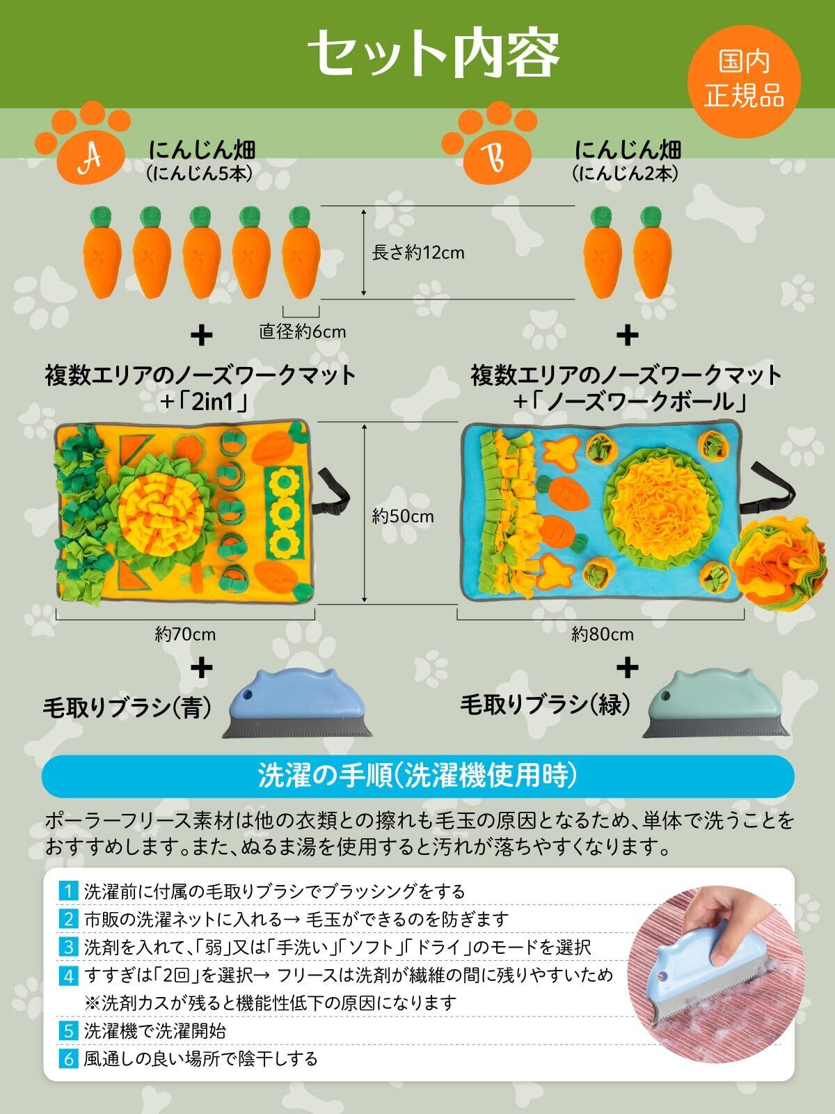 【主なセット内容/商品特徴】毛とりブラシ(青色)付き!✨世界一かわいいと話題のにんじん畑(にんじん5本) + 複数エリアのカラフルノーズワークマット + 『α』2in1ノーズワークマット(「マット型⇄ボウル型」変形)✨中心部分を紐で絞ることで立体的に形状が変化。この変化がワンちゃんの日々のノーズワークにいい刺激を。紐を縛ればボール型になり器としても機能するから、エサやおやつを飛び散らかしたくない時におすすめ。ボウルを絞ればさらに難易度アップ。