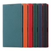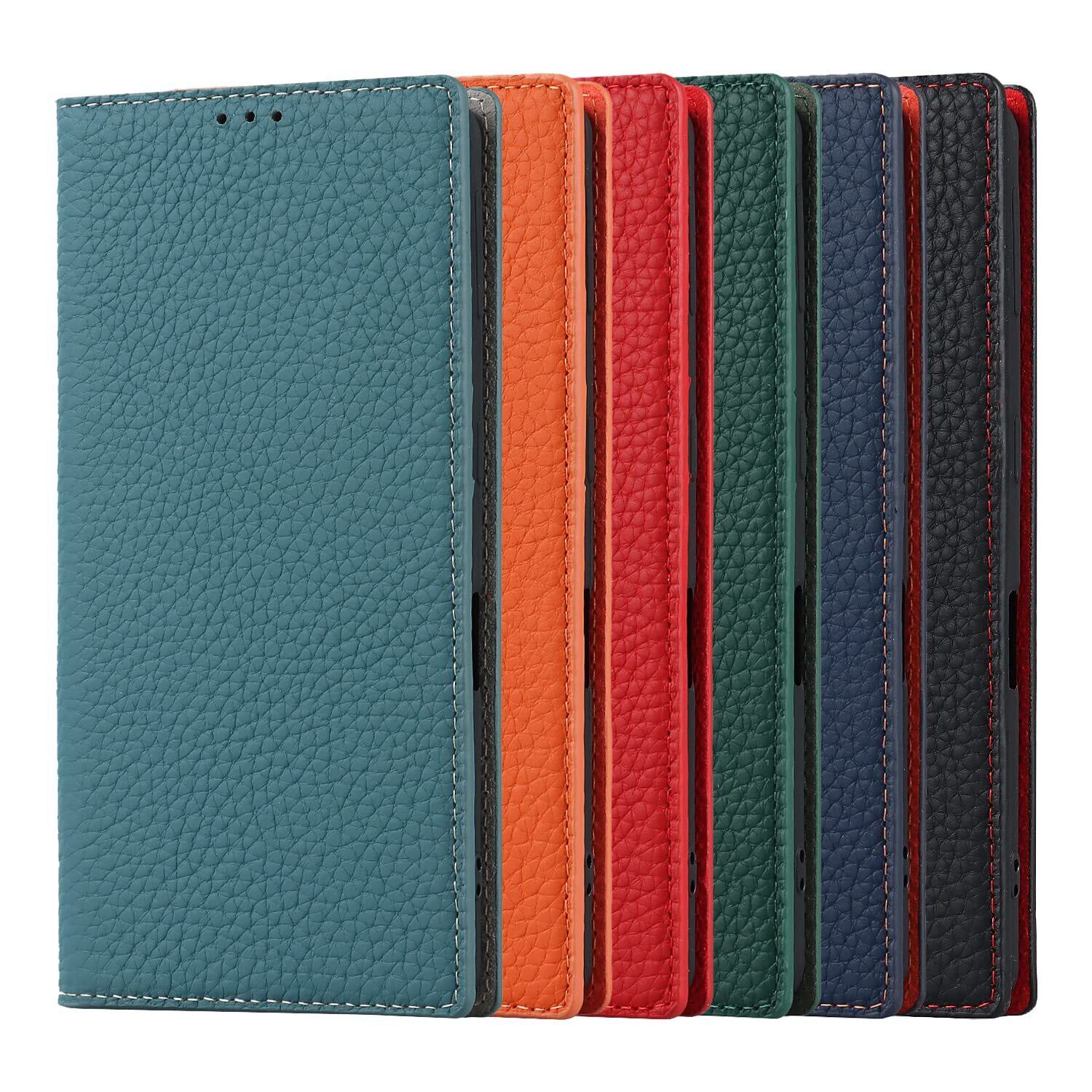 【素材】: シンプルさと高級感を兼ね備えたデザイン, 外殻は牛革製品 本革レザーを採用しており, 内側はスマートフォンにフィットし、隙間なくそれを保護するソフトTPUシリコーン材料で作られています。