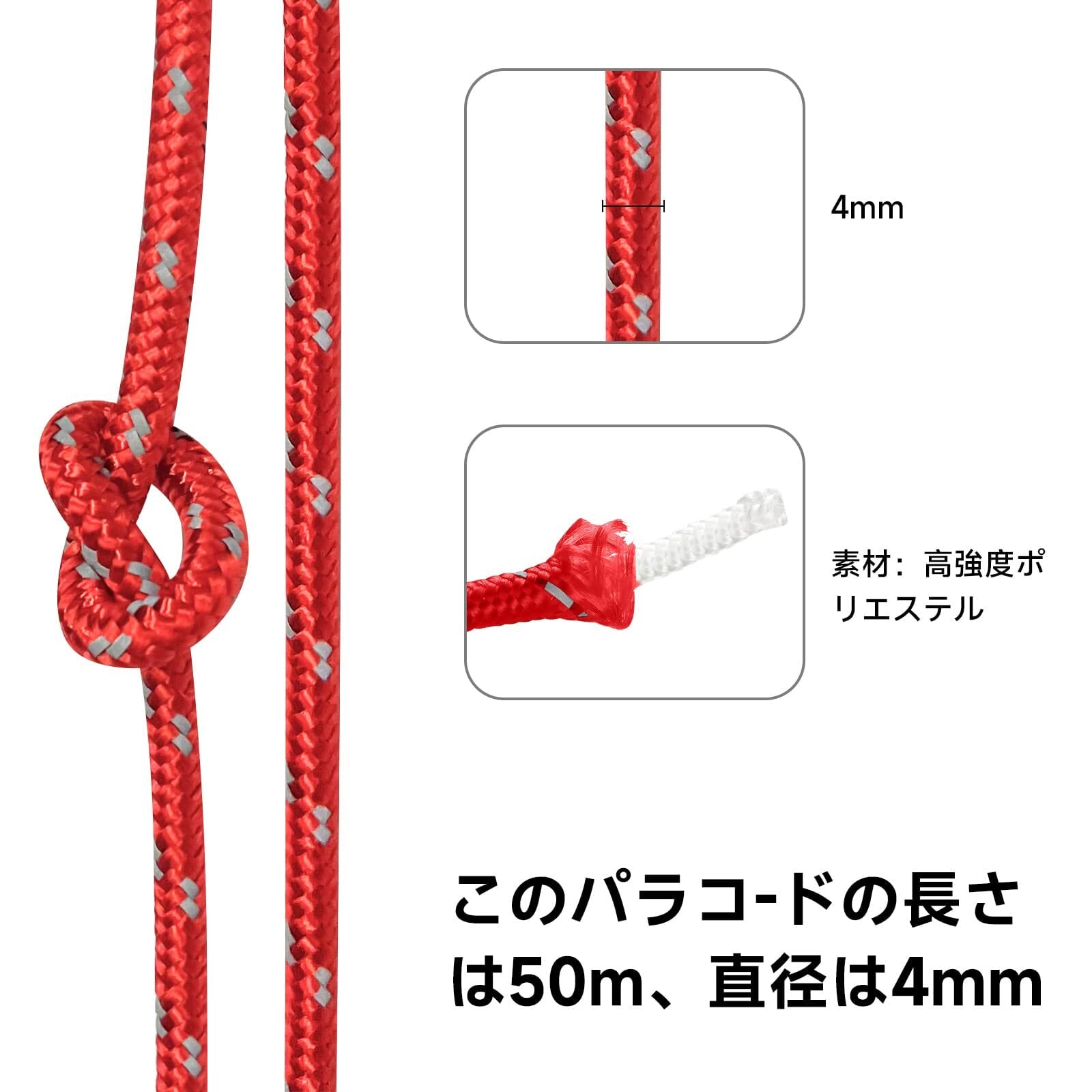 KOMCLUB テントロープ パラコード 反射材入り 張り綱 全長50m タープロープ ガイロープ 太さ4mm レッド