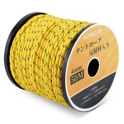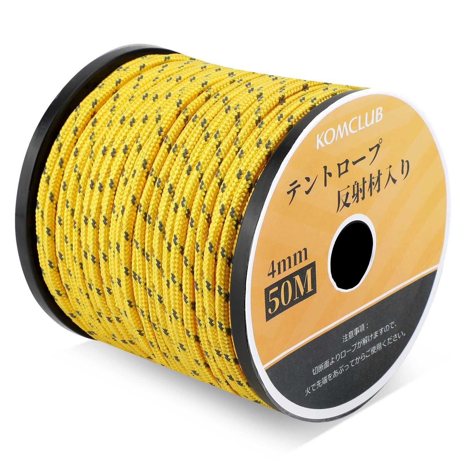 KOMCLUB テントロープ パラコード 反射材入り 張り綱 全長50m タープロープ ガイロープ 太さ4mm イエロー