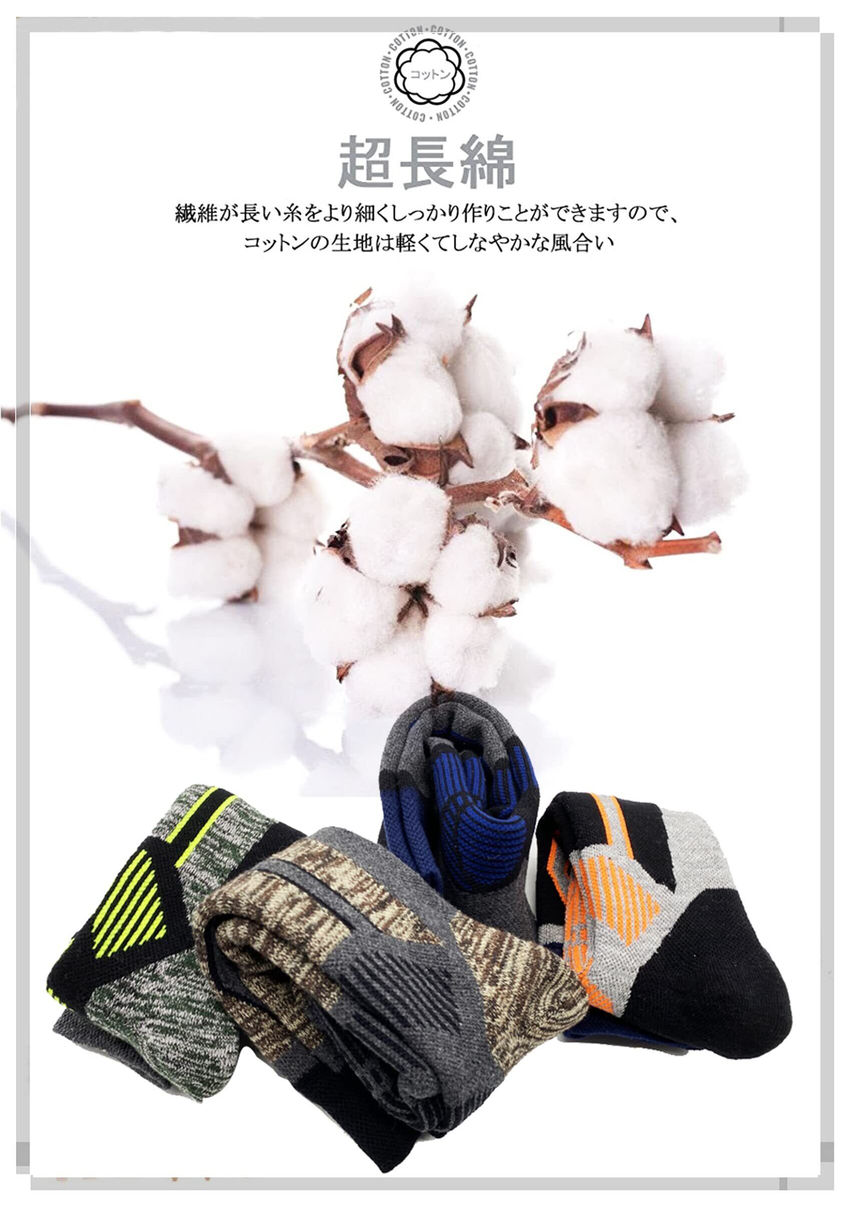 ③【足底パイル入り/アーチサポート】足底にモコモコ綿素材のパイルで暖かく、クッション性があり、長時間歩いても疲れにくい厚手ソックスです。独自の段階的着圧設計を採用し、アウトドア専用設計。最適な着圧機能が、筋肉や関節の自然な動きを支えて、運動中の疲労感を軽減できるスノーボードソックス。