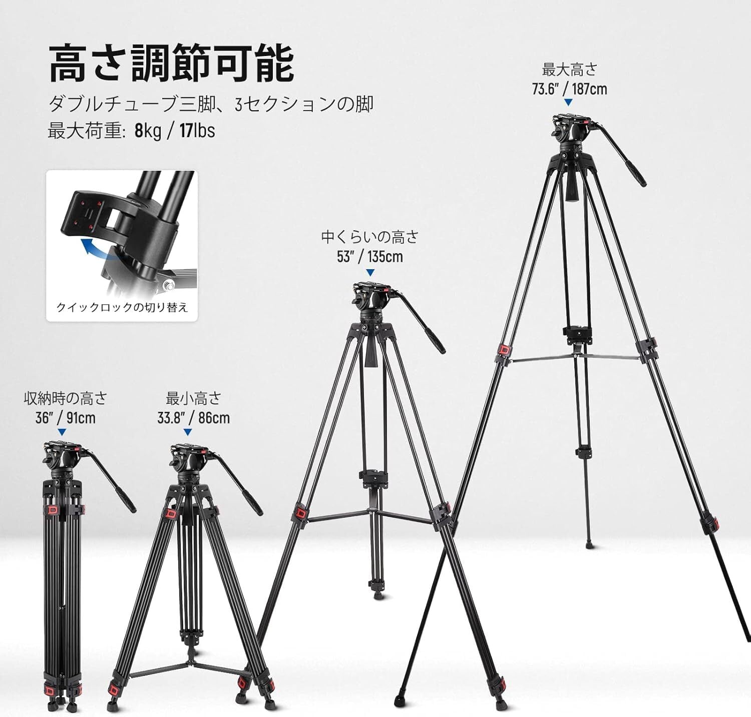 NEEWER ビデオ三脚 187cm ビデオ雲台 QRプレート付き コンパチブル DJI RSジンバル 大型 プロな三脚 伸縮ハンドルスケールベース DSLR 一眼レフ/ビデオカメラに適用 耐荷重8kg TP74