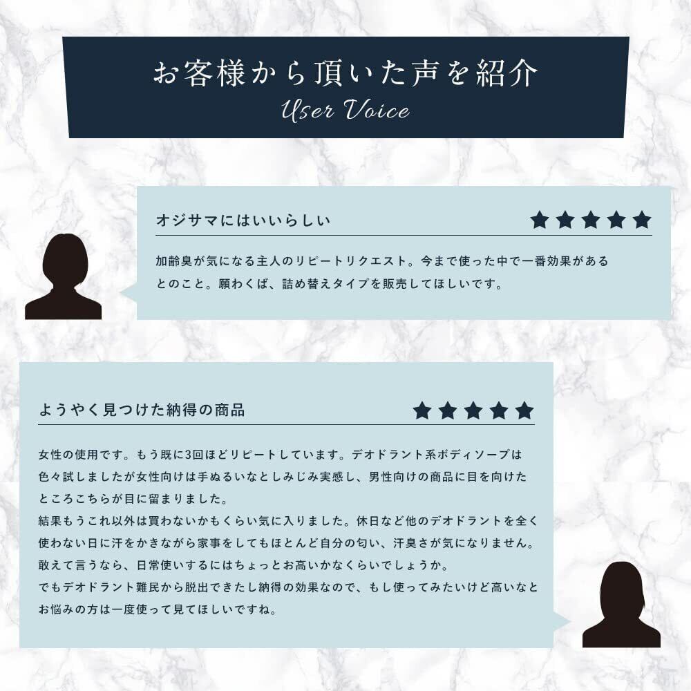 加齢臭が気になる、最近、背中のニキビが増えてきた、足の臭い、脇臭いが気になる、そんなお悩みに寄り添ったボディソープです。