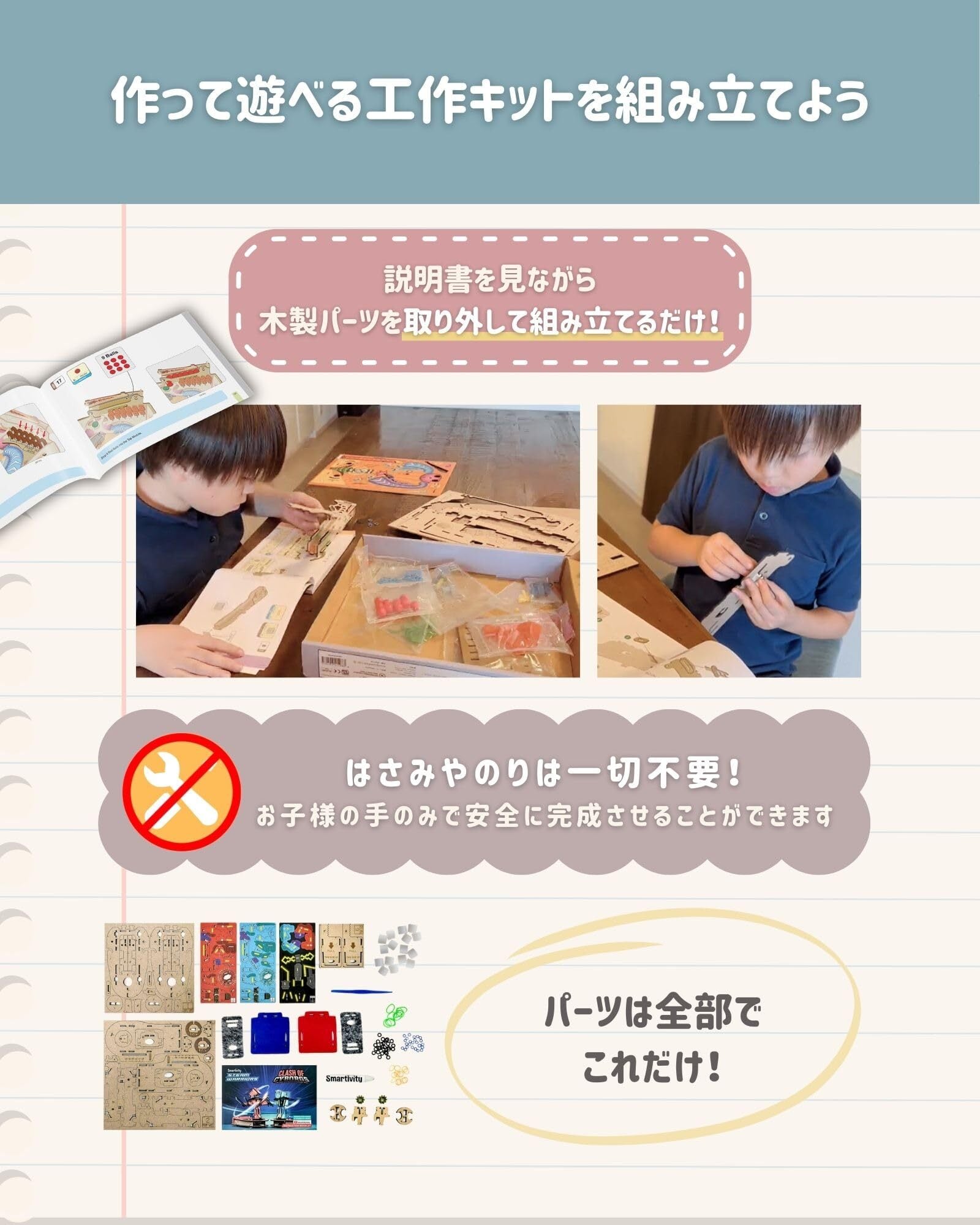 【「つくって遊ぶ」で未来ではばたく力を養う】組み立てパズルは1から自分で組み立てることで考える力、スタートからゴールまでを設計する計算力や想像力が鍛えられます。あえて少し難しい課題にチャレンジし失敗や挫折を経験することで、自ら考えてやり切る力を伸ばすことができ、完成した時のよろこびと達成感は子どもに自信を持たせ、自ら行動する意欲へとつながるでしょう。組み立てる面白さと遊ぶ楽しさを感じながら、集中力が培われる知育玩具です。 組み立てには別途の接着剤や工具は一切必要なく、シンプルでありながら奥の深い組み立て工程は子どもを夢中にさせます。年齢にあわせたイラスト中心の組み立て説明書(日本語)付きで、YouTubeで組み立て方や遊び方についての解説動画もご用意。組み立て方に悩んだ時でも説明書や動画を見て、自分の力で情報を整理して考えさせることが可能です。