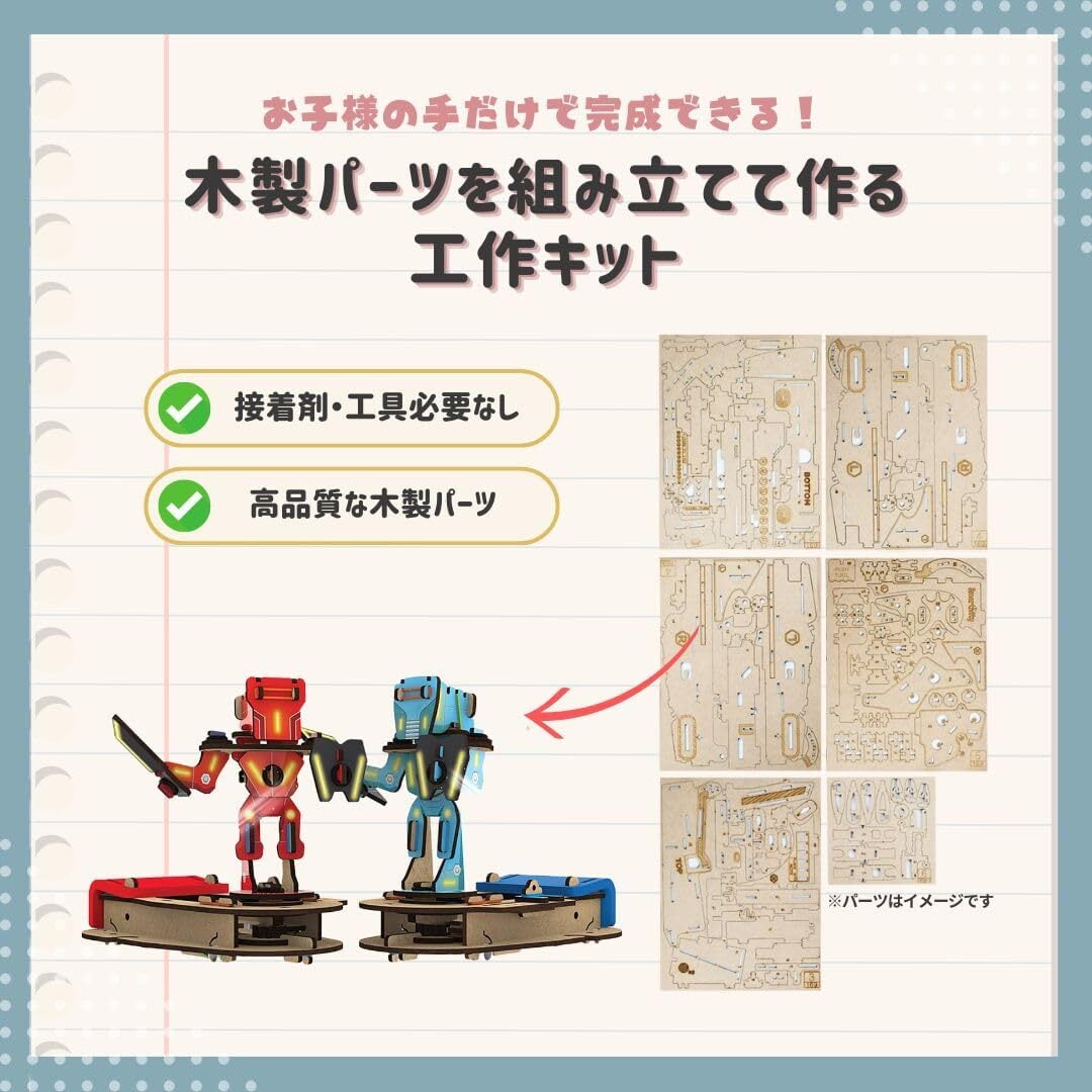 【科学の基礎を作って学べる工作キット 夏休みの自由研究に】歯車(ギア)の仕組みで動かして戦うサイボーグがつくれる組み立てパズルです。遊び方は攻撃がヒットして頭が外れる、パーツが取れる、サイボーグ自体が外れるなどでポイントゲットとなり、遊びながらサイボーグの動きによってギアの仕組みや遠心力を学べます。1つのキットに赤色と水色の2体分入っているので、兄弟や姉妹、親子で1つずつ一緒につくることが可能です。遊びながら科学的概念を学ぶことができる、好きが見つかる、知的好奇心が育まれる、DIY型STEAMTOY、知育玩具です。