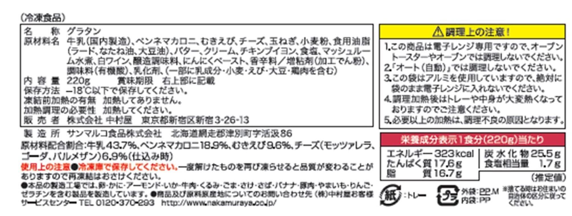牛乳(国内製造)、ペンネマカロニ、むきえび、チーズ、玉ねぎ、小麦粉、食用油脂(ラード、なたね油、大豆油)、バター、クリーム、チキンブイヨン、食塩、マッシュルーム水煮、白ワイン、醸造調味料、にんにくペースト、香辛料/増粘剤(加工でん粉)、調味料(有機酸)、乳化剤、(一部に乳成分・小麦・えび・大豆・鶏肉を含む)