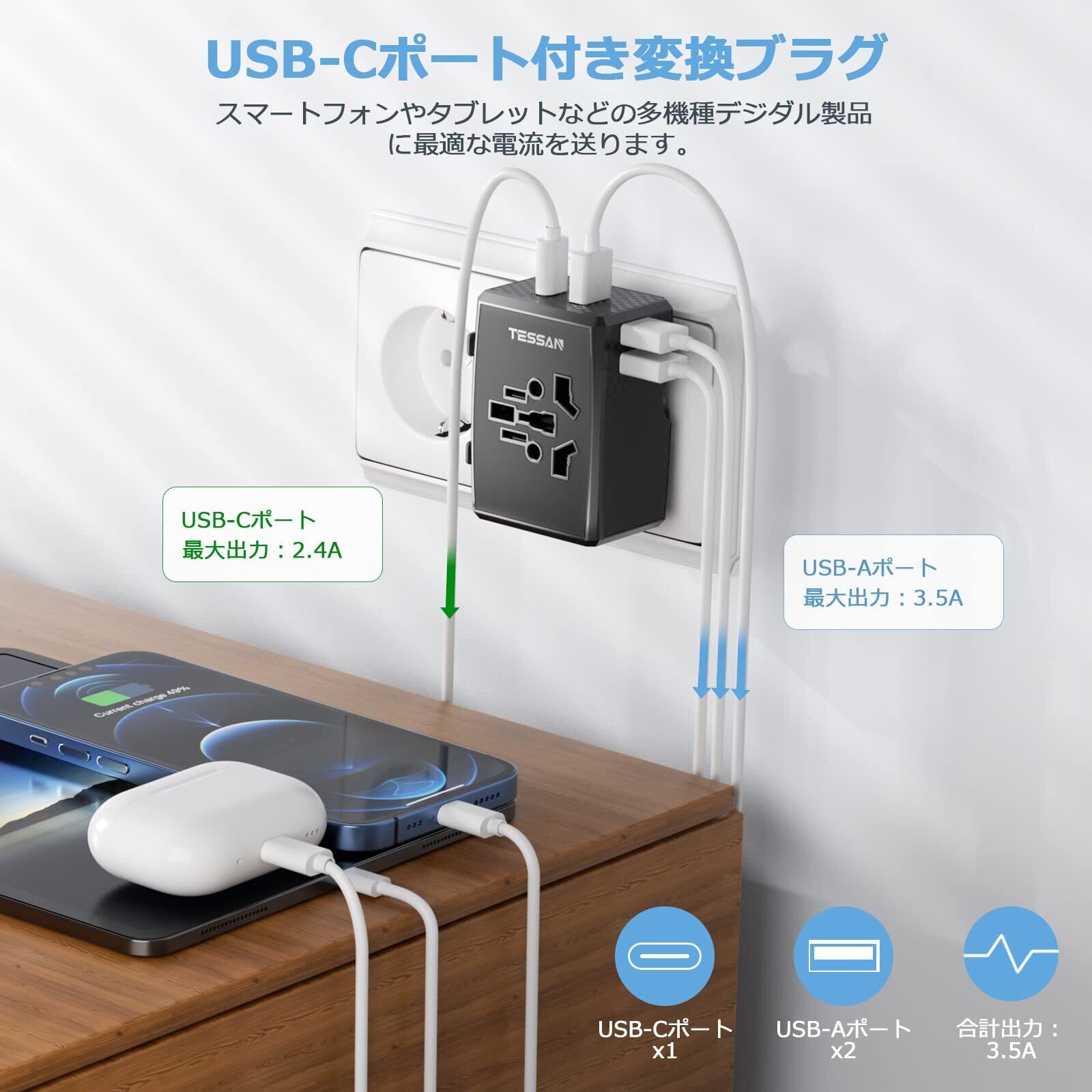 【USB-Cポート付き海外変換プラグ】3つUSB-AポートとUSB-Cポートがあります。単一USB-Aポートの最大出力は5V 2.4A、USB-Cポートの最大出力は5V 3.0Aので、4個USBポートは合計5V 3.5Aになります。このマルチ変換プラグはスマートフォンやタブレットなどの多機種デジダル製品に適しています。